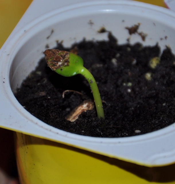 Momentan sitzt es noch in einem Fruchtzwergebecher mit Anzuchterde.