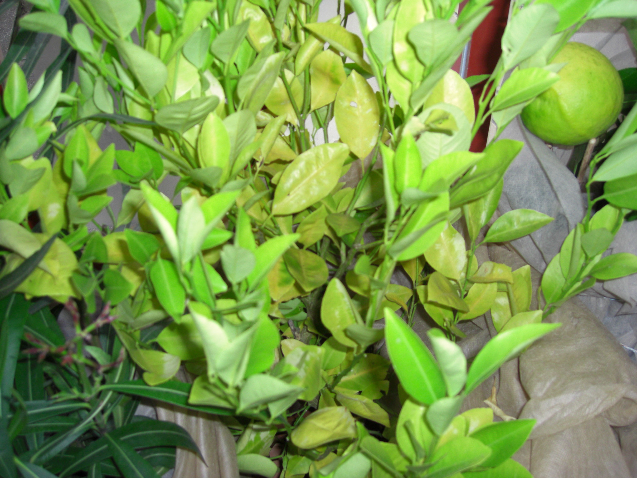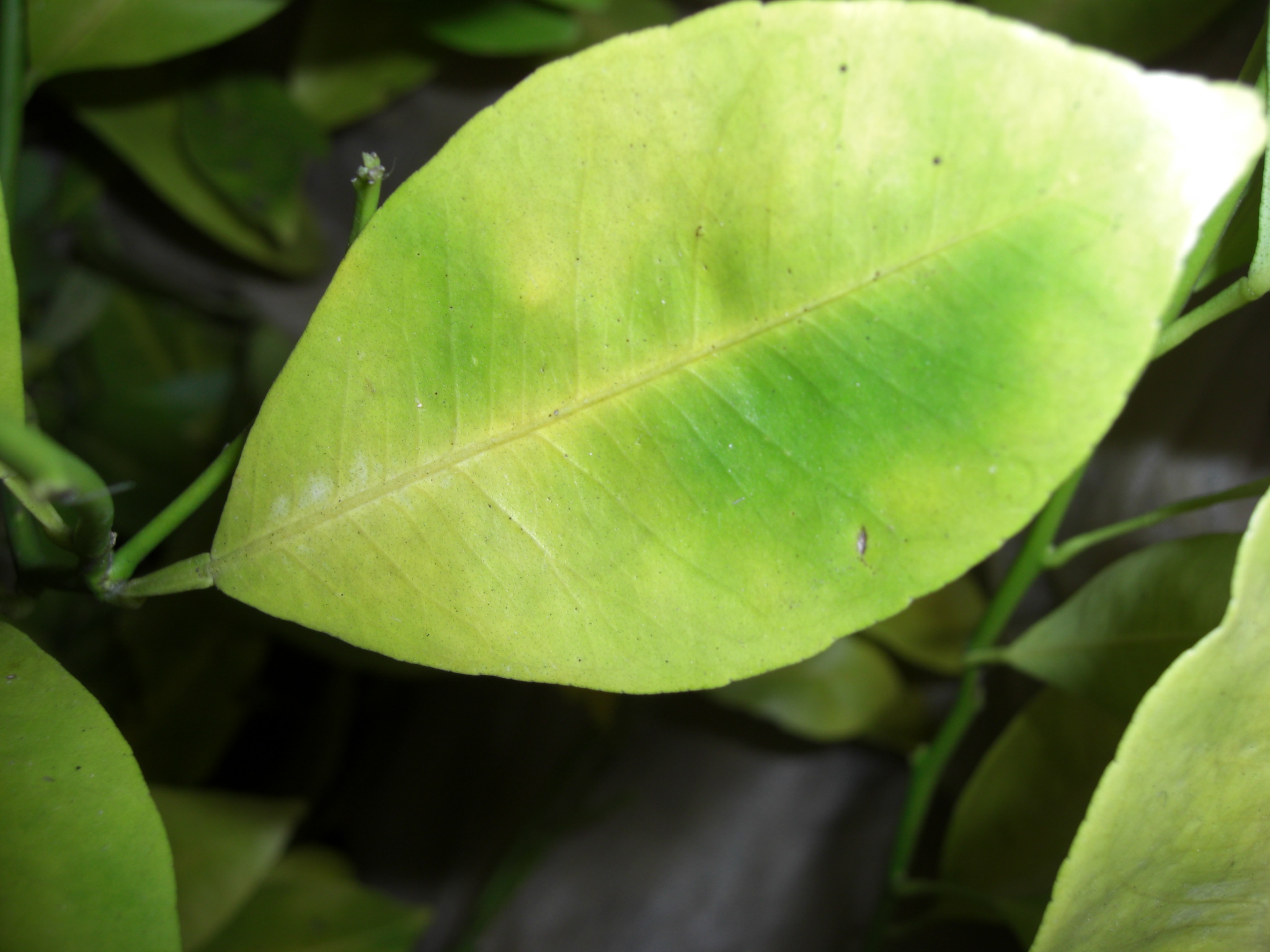 habe hier ein paar Bilder von meiner Orange, die seit letztem jahr immer heller wurde. Die Neutriebe sind sehr hell grün, die älteren Blätter ganz gelb mit zum Teil ganz hell grünen Flecken, es sind keine grünen Adern sichtbar.