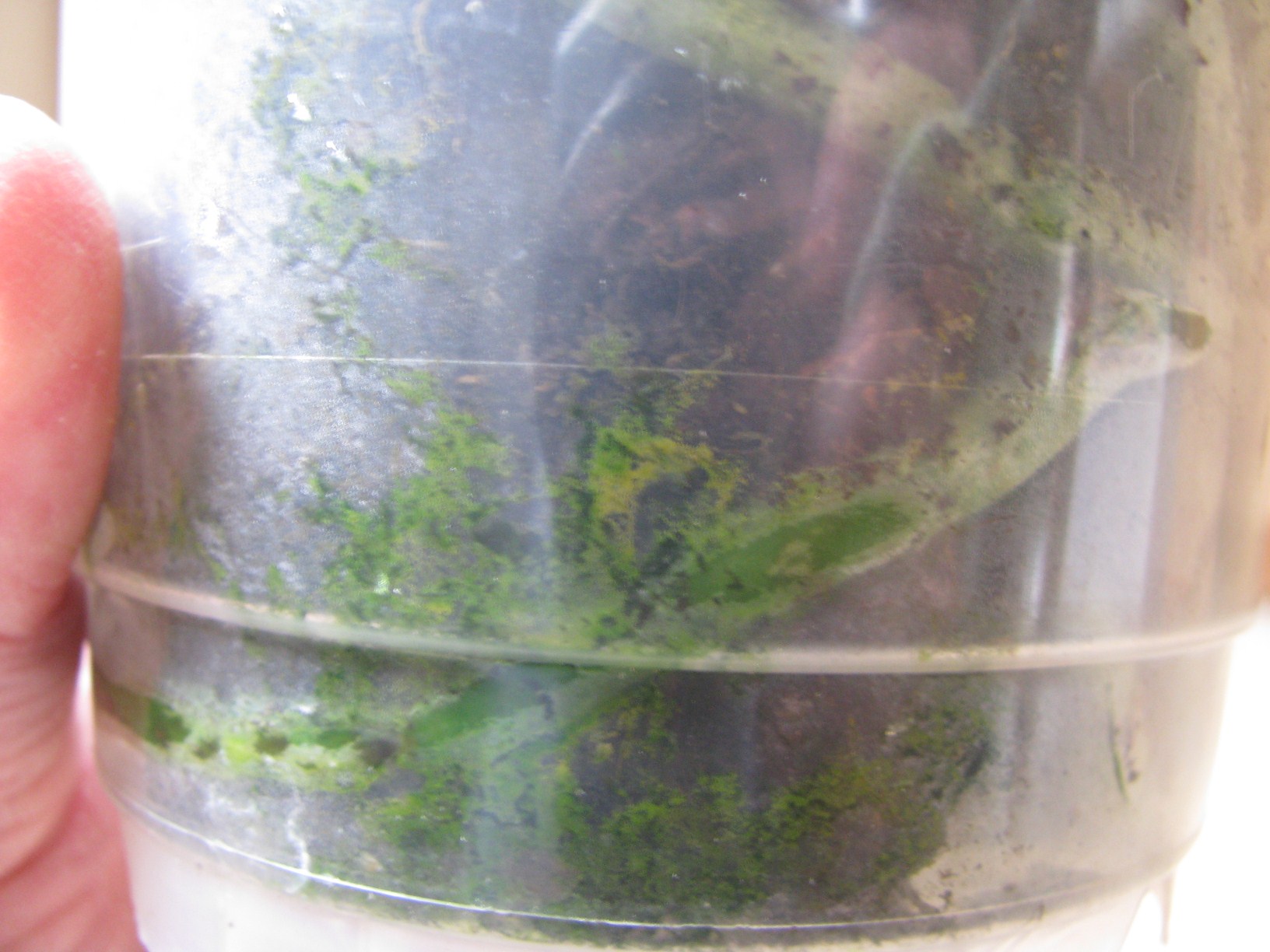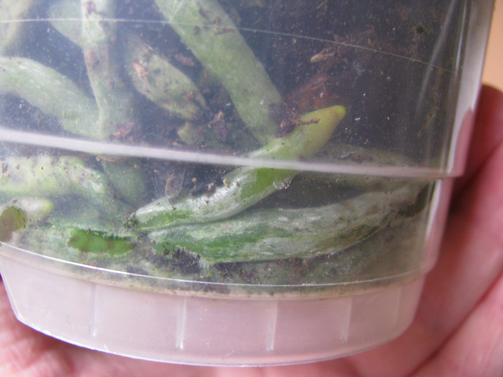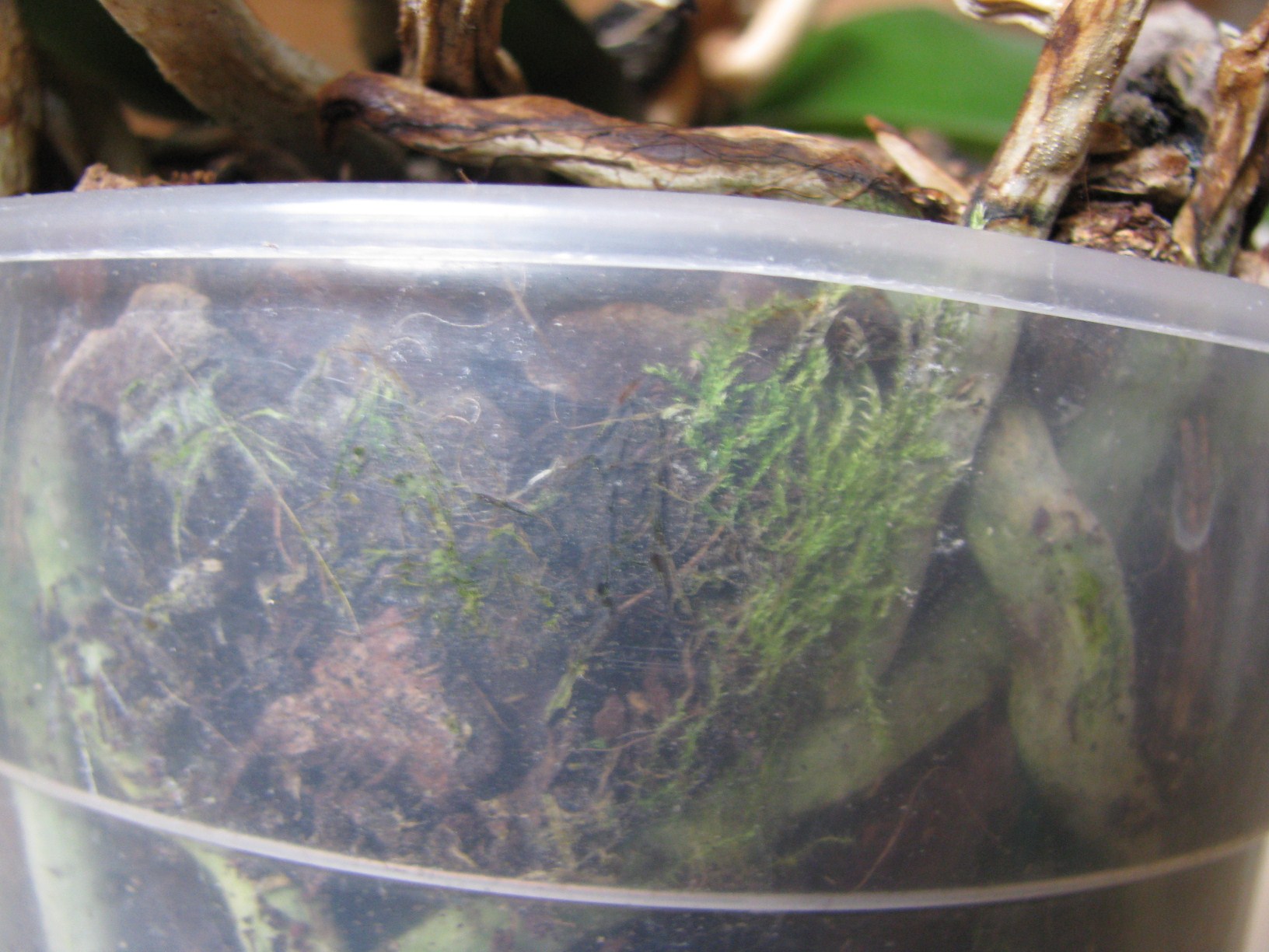 Plastiktüte: Großer dursichtiger Beutel (Gefrierbeutel) den man verschließen kann. Das Klima innerhalb der Tüte hilft der Orchidee bei der Feutigkeitsverwaltung (gespannte Luft - Treibausklima), denn auch die Blätter können Feuchtigkeit aufnehmen.