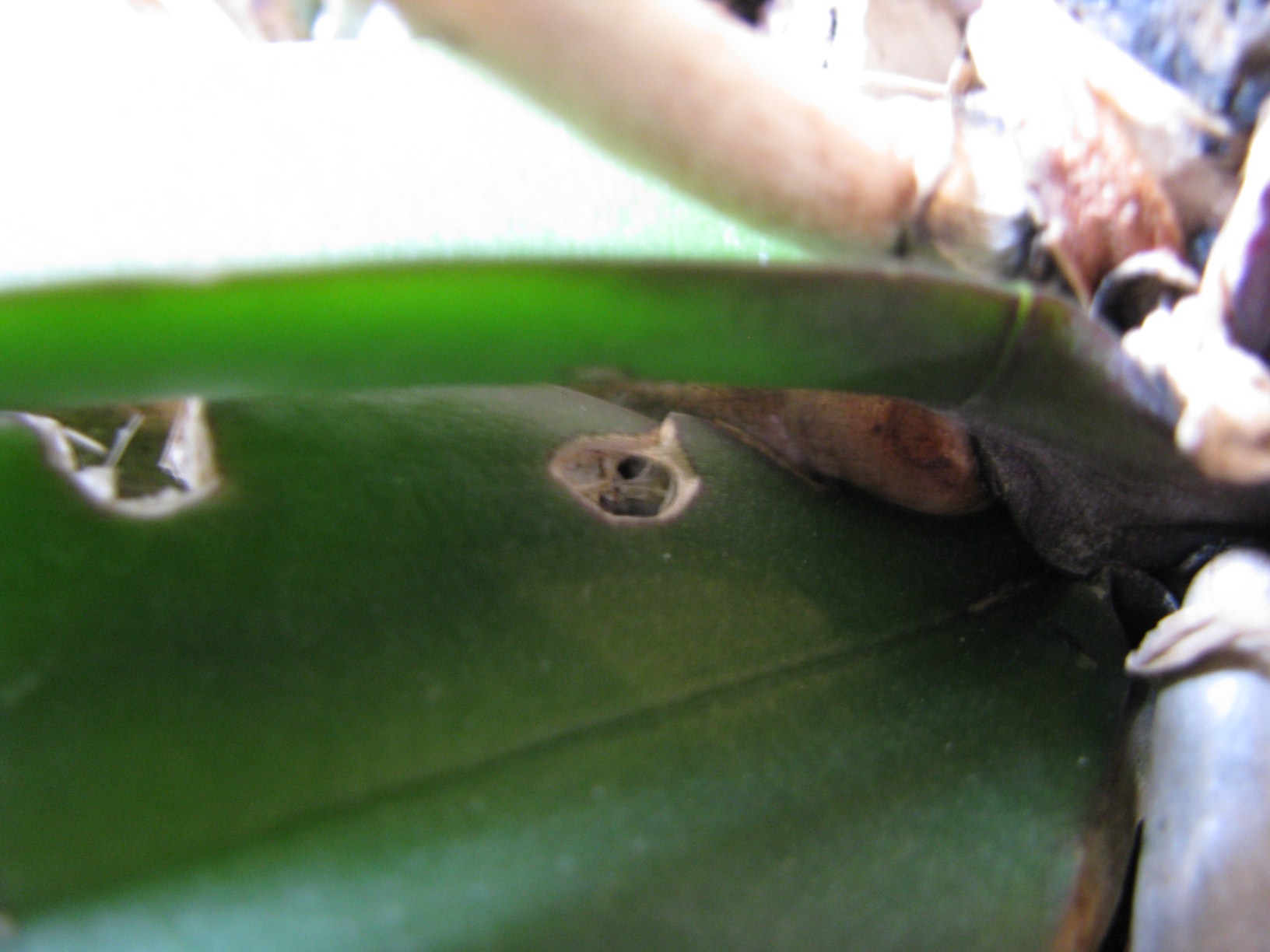 Die beiden Löcher in dem Blatt könnten von so einem Blütenstab sein. Manche rammeln die einfach durch die Blätter durch um den Blütentrieb zu stützen