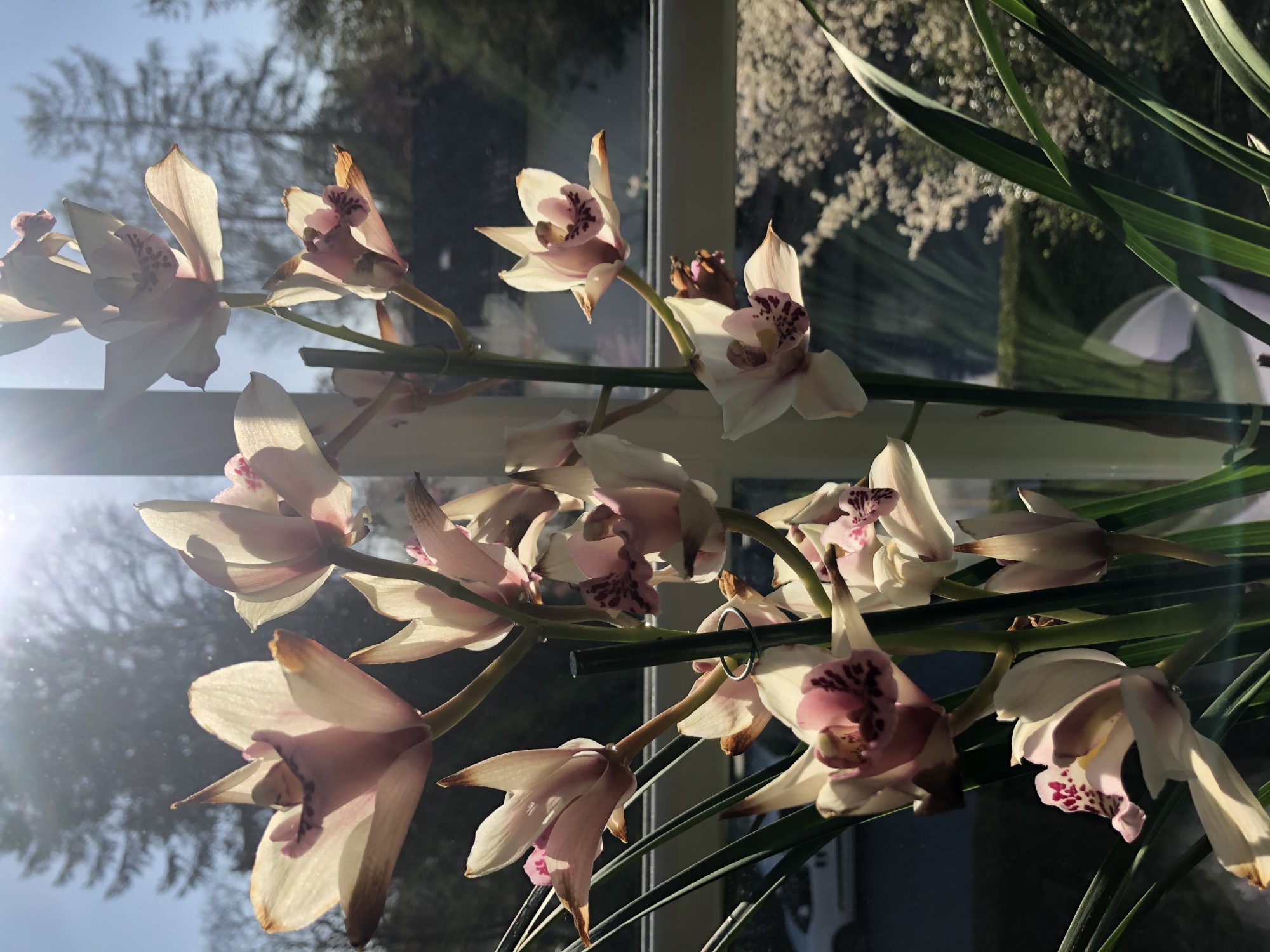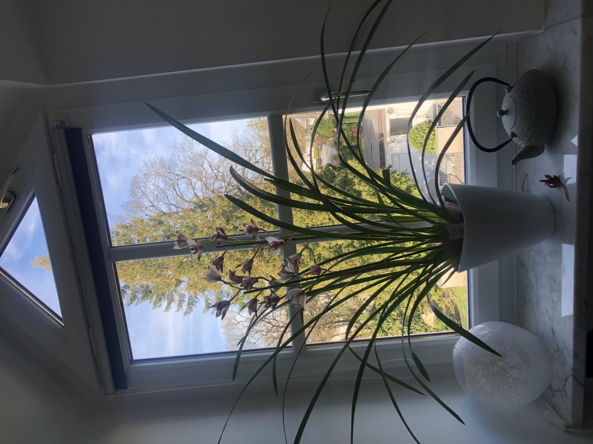 Ich habe mir vor ein paar Wochen eine richtig schöne Orchidee Cymbidium (Orchidiva) geholt. Hatte sie die ganze Zeit im Schlafzimmer am Schreibtisch. Hier ist es eigentlich schon recht hell. Sie bekam Licht von der Südbalkontür die etwa 4 m weg ist und durchs Dachfenster kam morgens Richtung Osten auch immer Licht rein.