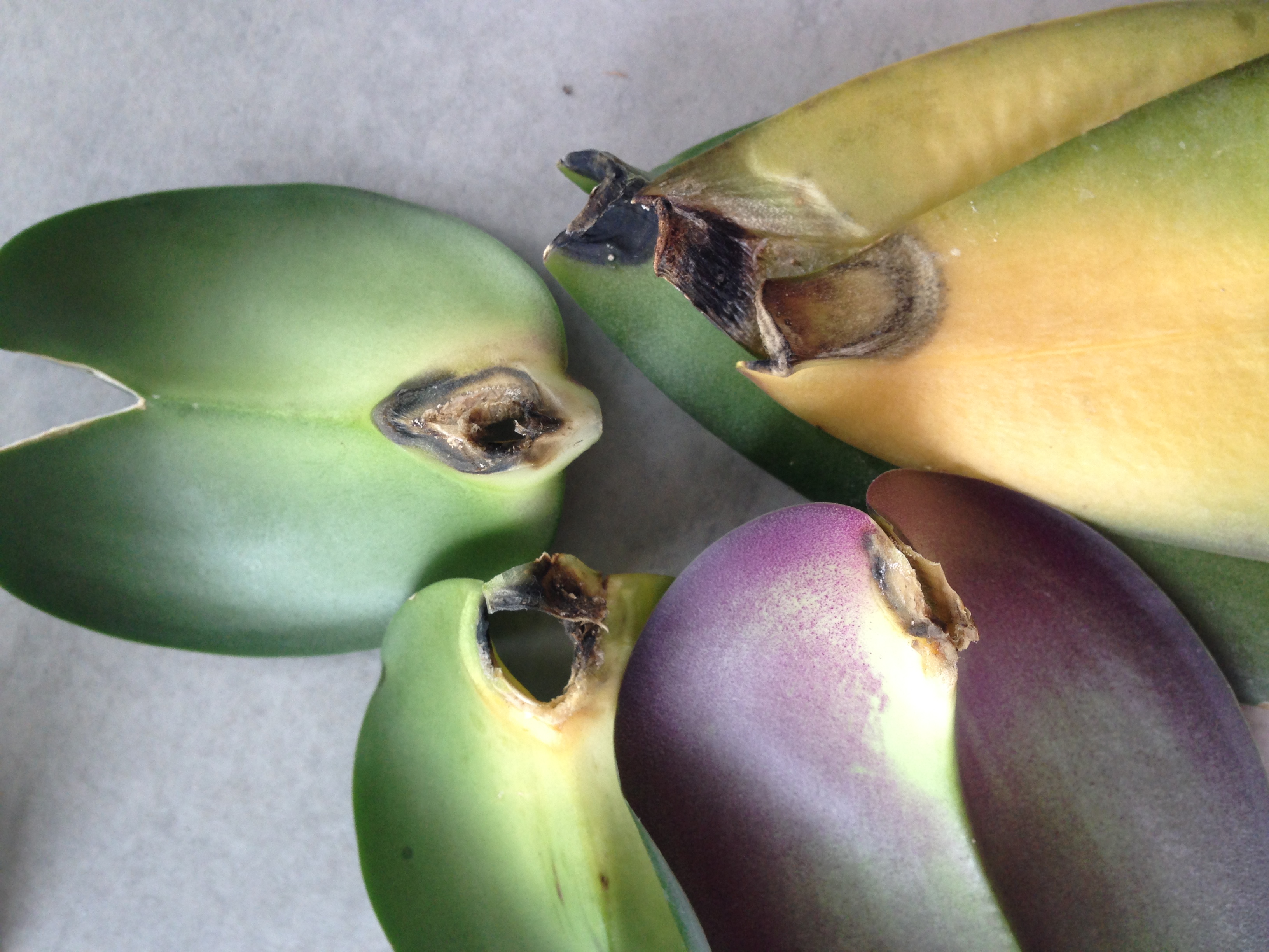 meiner Orchidee geht's garnicht gut. Heute sind mir alle Blätter in die Hände gefallen. Ich pflege sie wie alle anderen Orchideen hier und der Standort ist auch gleich. Allen anderen geht es super. Aber irgendwas hat ihr wohl nicht gefallen. Die Blätter sind innen abgefault, so sieht es aus. Aber sie hat noch schöne grüne Wurzeln. Meint ihr sie treibt noch mal aus oder macht Kindel?