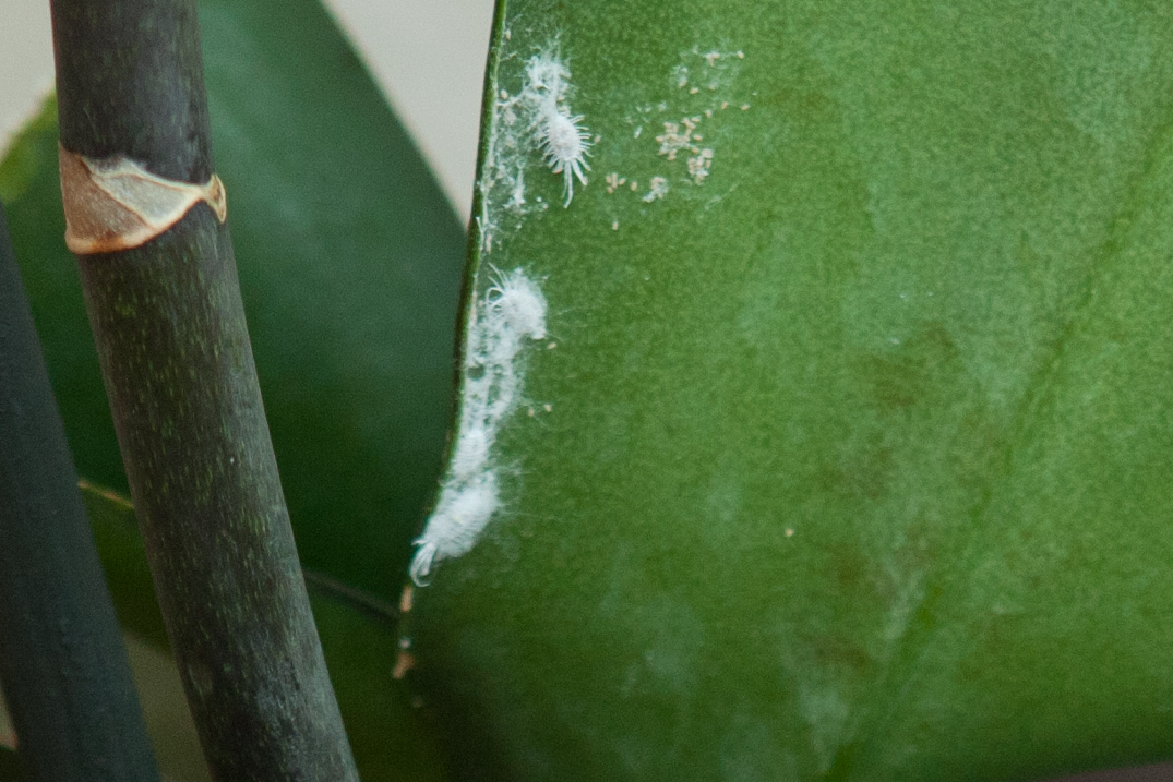 An meiner Orchidee hat es plötzlich so weissen Staub mit weissen Tierchen, auf dem Foto könnt ihr sie gut erkennen. Was ist das und was kann ich dagegen tun?