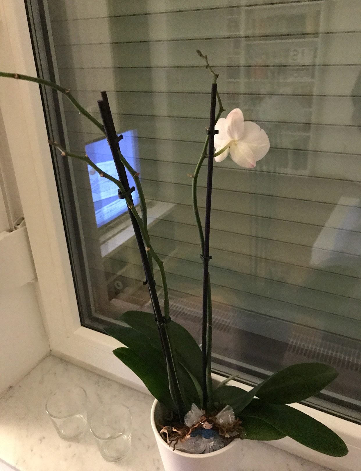 Nun habe ich eine Orchidee (Phalaenopsis), die ich im Oktober gekauft habe. Damals hatte sie bereits alle Blüten, die alle geöffnet waren. Die Pflanze hat sich super gehalten, bis vor zwei Wochen die Blüten zusammengesackt und abgefallen sind. Mittlerweile ist nur noch eine übrig.