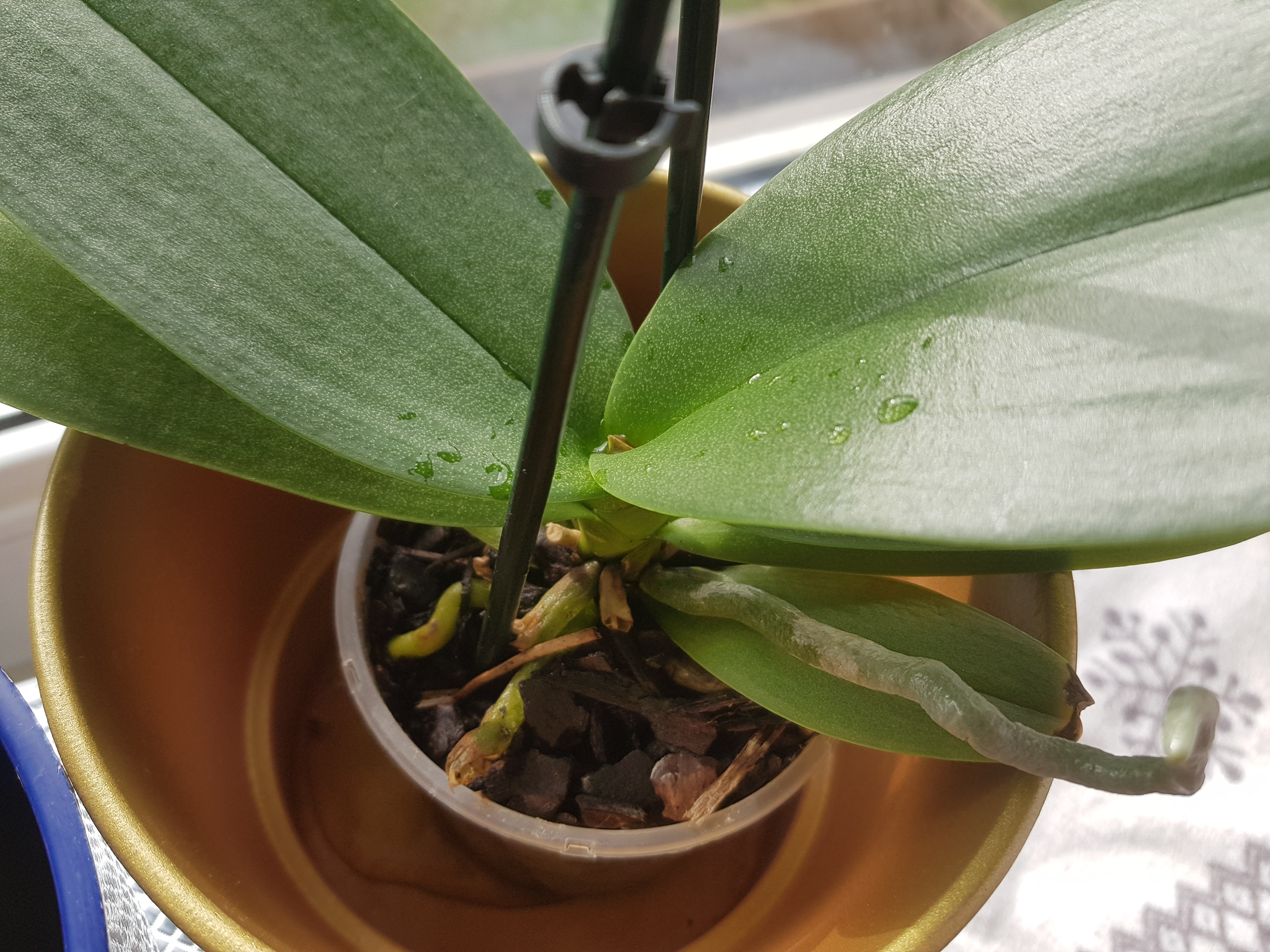 Ich hab sie beim Umtopfen mit Geschenkstreifchen befestigt damit sie nicht umfällt wie es in einem YouTube Video gesehen habe. Wann darf ich es abmachen?