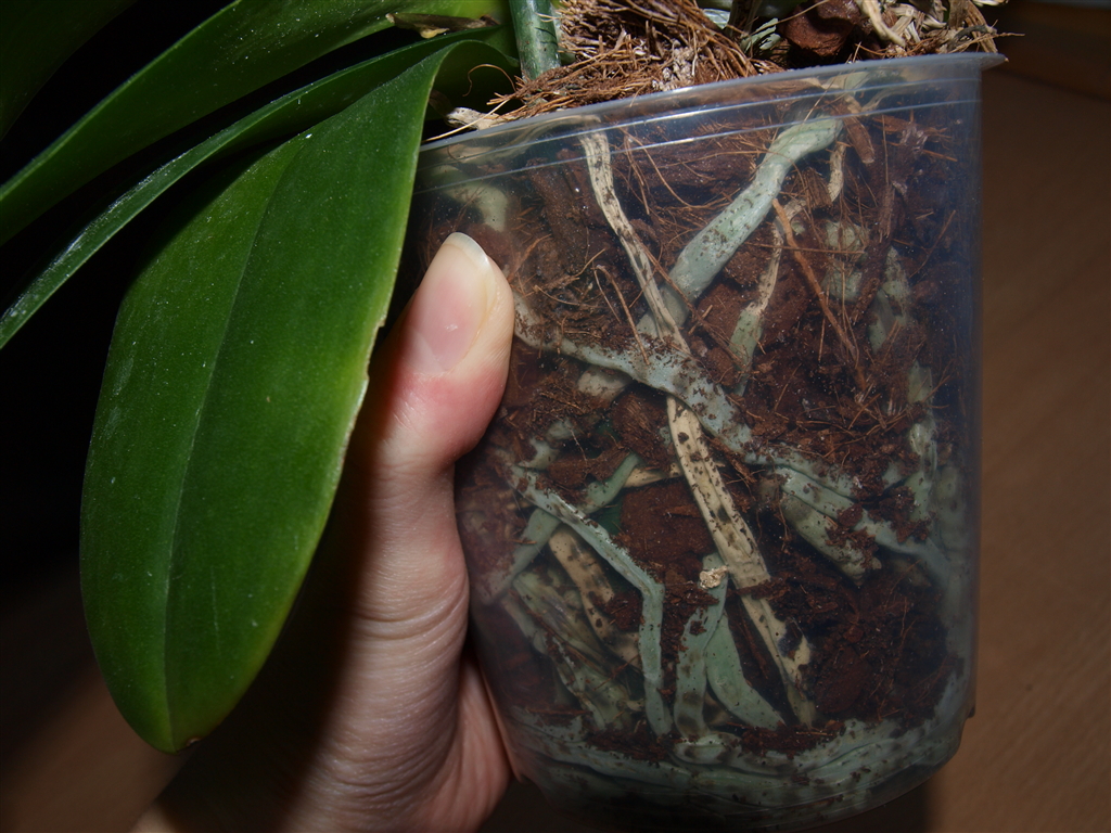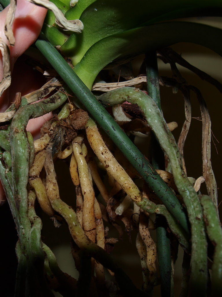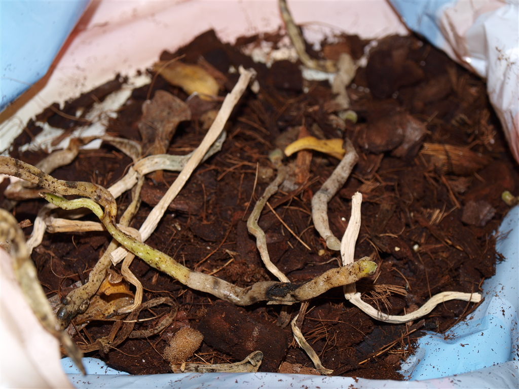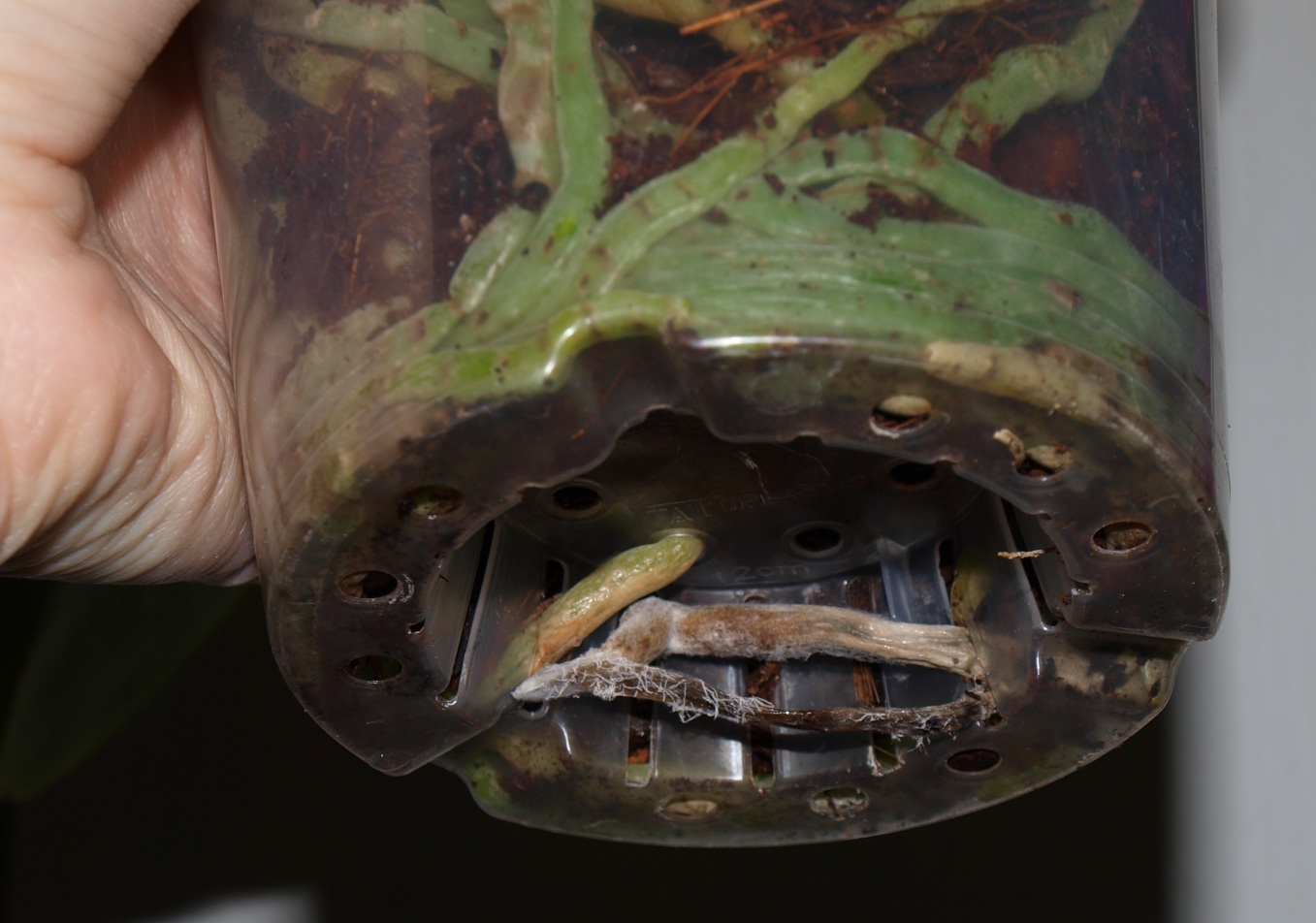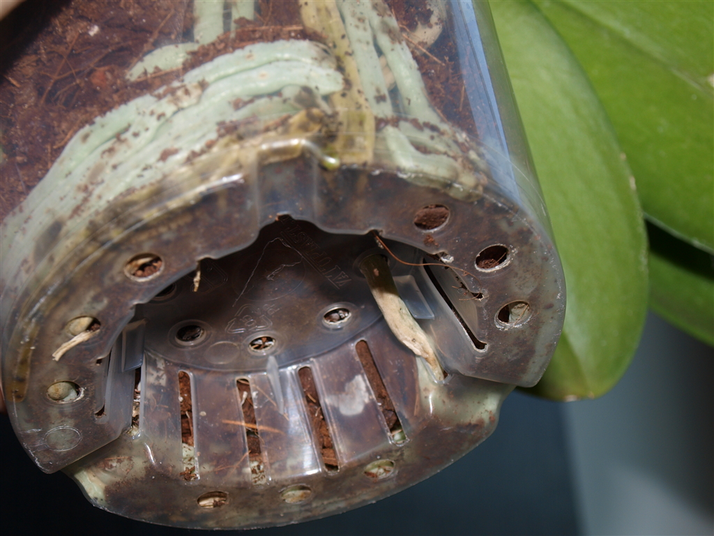 Ich hab so wenig gegossen, dass ich gar nicht daran dachte dass da etwas drinnen bleiben oder runter rinnen könnte. Nachdem aber nun einige Knospen abgefallen sind und andere sehr locker wirken, hab ich mal nach gesehen und musste leider fest stellen, dass im Außengefäß eine Mini-Lacke über geblieben ist und die Wurzeln an der Stelle bereits zu schimmeln begonnen haben!