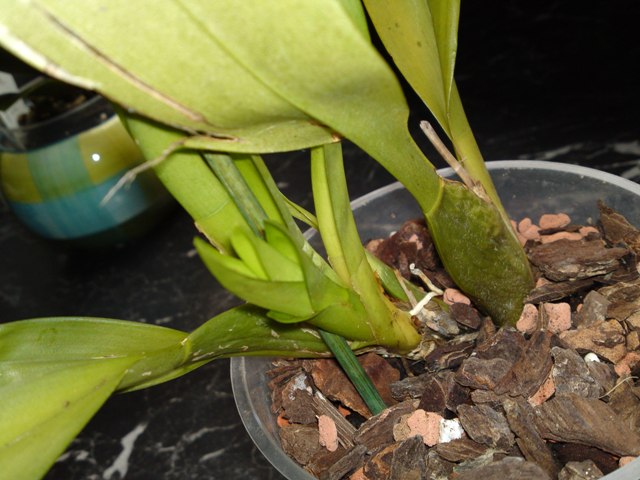 - lange dünne "Knollen", wenig Blätter = Cattleya