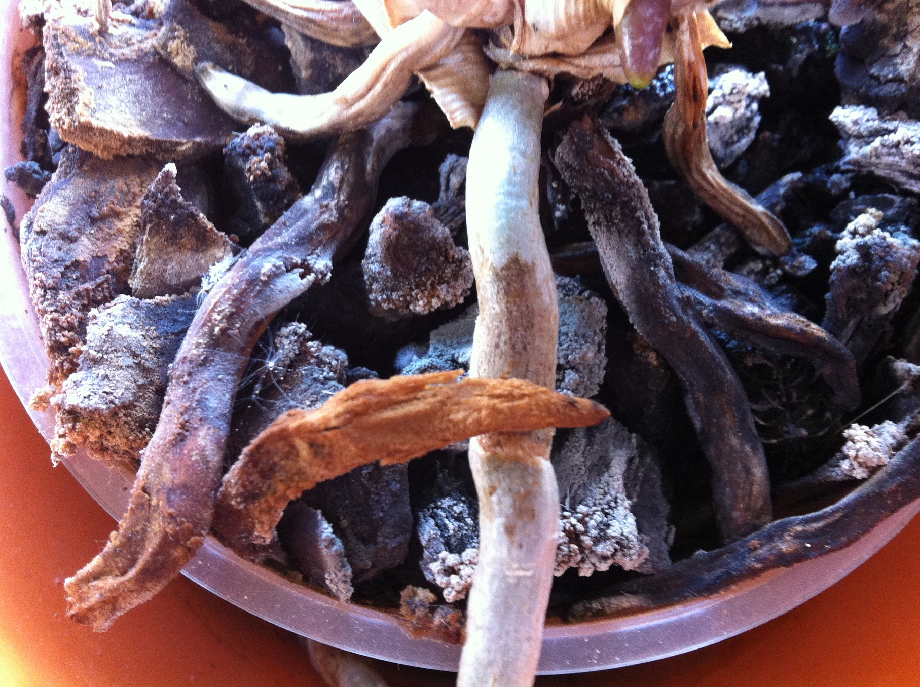 Alle ihre Orchis stehen immer in ihren übertöpfen, die immer wirklich halb voll sind mit stehendem Wasser. Das Substrat ist komplett vergammelt, die Wurzeln auch. Und trotzdem schaffen es diese Pflanzen, das zu überleben!!! Eine fand ich extrem genial die bestand nur noch aus zwei vertrockneten Blütenstengeln. und DENNOCH trieb aus dem komplett vertrockneten Herzen (ohne Blätter wohlgemerkt) eine neue, frische Wurzel und ein neues, frisches Blatt. Von ihr habe ich keine Fotos gemacht - aber dafür von diesem Exemplar weiter unten...das sieht so eklig aus, in was die Pflanze da steht - aber anscheinend hat sie sich angepasst und trinkt durch die eine lange Wurzel wie durch einen Trinkhalm ausm Topf...