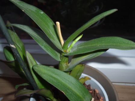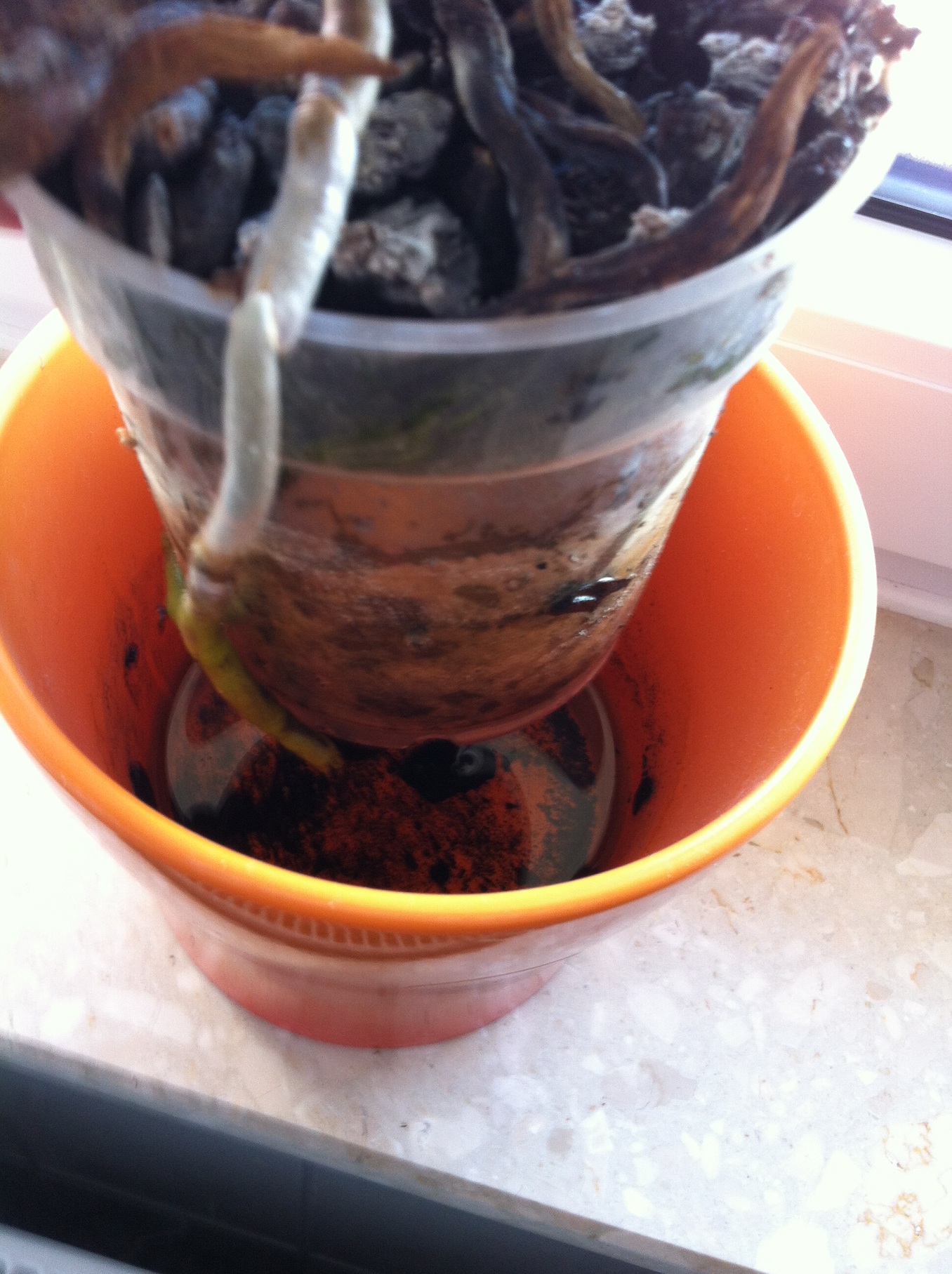 Alle ihre Orchis stehen immer in ihren übertöpfen, die immer wirklich halb voll sind mit stehendem Wasser. Das Substrat ist komplett vergammelt, die Wurzeln auch. Und trotzdem schaffen es diese Pflanzen, das zu überleben!!! Eine fand ich extrem genial die bestand nur noch aus zwei vertrockneten Blütenstengeln. und DENNOCH trieb aus dem komplett vertrockneten Herzen (ohne Blätter wohlgemerkt) eine neue, frische Wurzel und ein neues, frisches Blatt. Von ihr habe ich keine Fotos gemacht - aber dafür von diesem Exemplar weiter unten...das sieht so eklig aus, in was die Pflanze da steht - aber anscheinend hat sie sich angepasst und trinkt durch die eine lange Wurzel wie durch einen Trinkhalm ausm Topf...