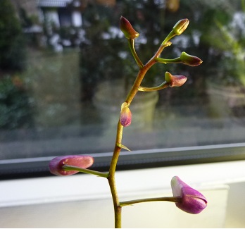 meine Cymbidien standen bis zum ersten Frost draußen und dann werden sie auf den Boden geräumt(eigentlich keine guten Bedingungen)und da die eine so eigenartige Triebe bekommen hat ,habe ich Fotos einem netten Forenmitglied geschickt und es sind Blütentriebe.Jetzt hat die eine Cymbidie einen hellen kühlen Treppenhausplatz und ich hoffe dass die Blüten es schaffen