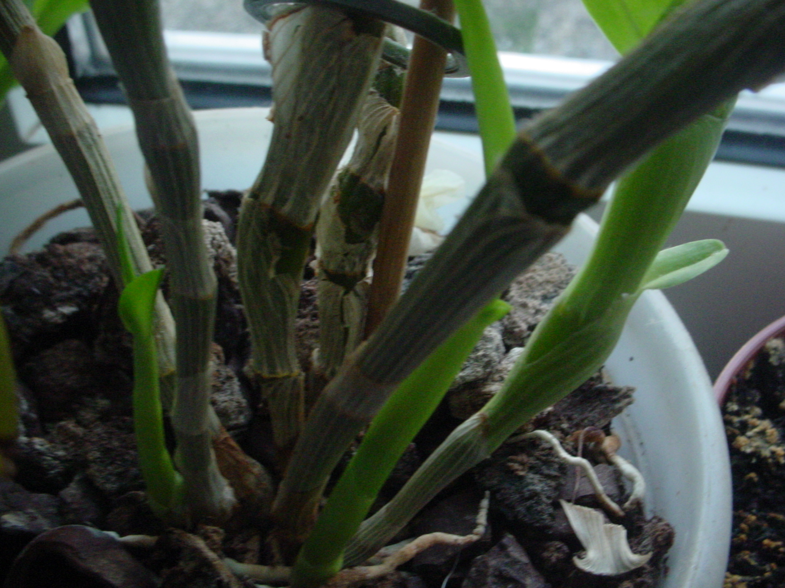 @Skahexe, die laubwerdenden Arten haben jetzt im Winter keine Blätter . Aber ich hab mal geguckt, ob ich Bilder von den Stammknollen finde. Bei den laubwerfenden Arten der Untergattung Preptanthe sind diese deutlich ausgebildet. Mit oder ohne "Strangulation". Bei Calanthe im engeren Sinne sind sie klein und in den Blattbasen kaum zu sehen. Dann natürlich, wie gesagt, die laubwerdenden haben jetzt keine Blätter.