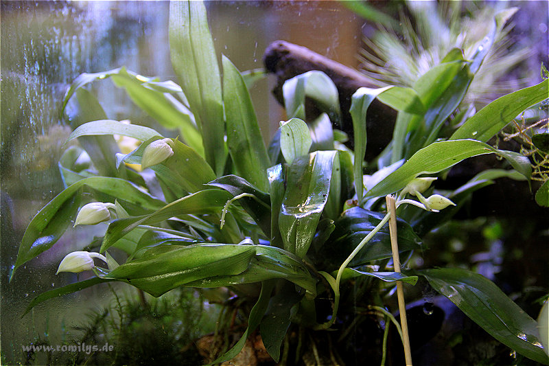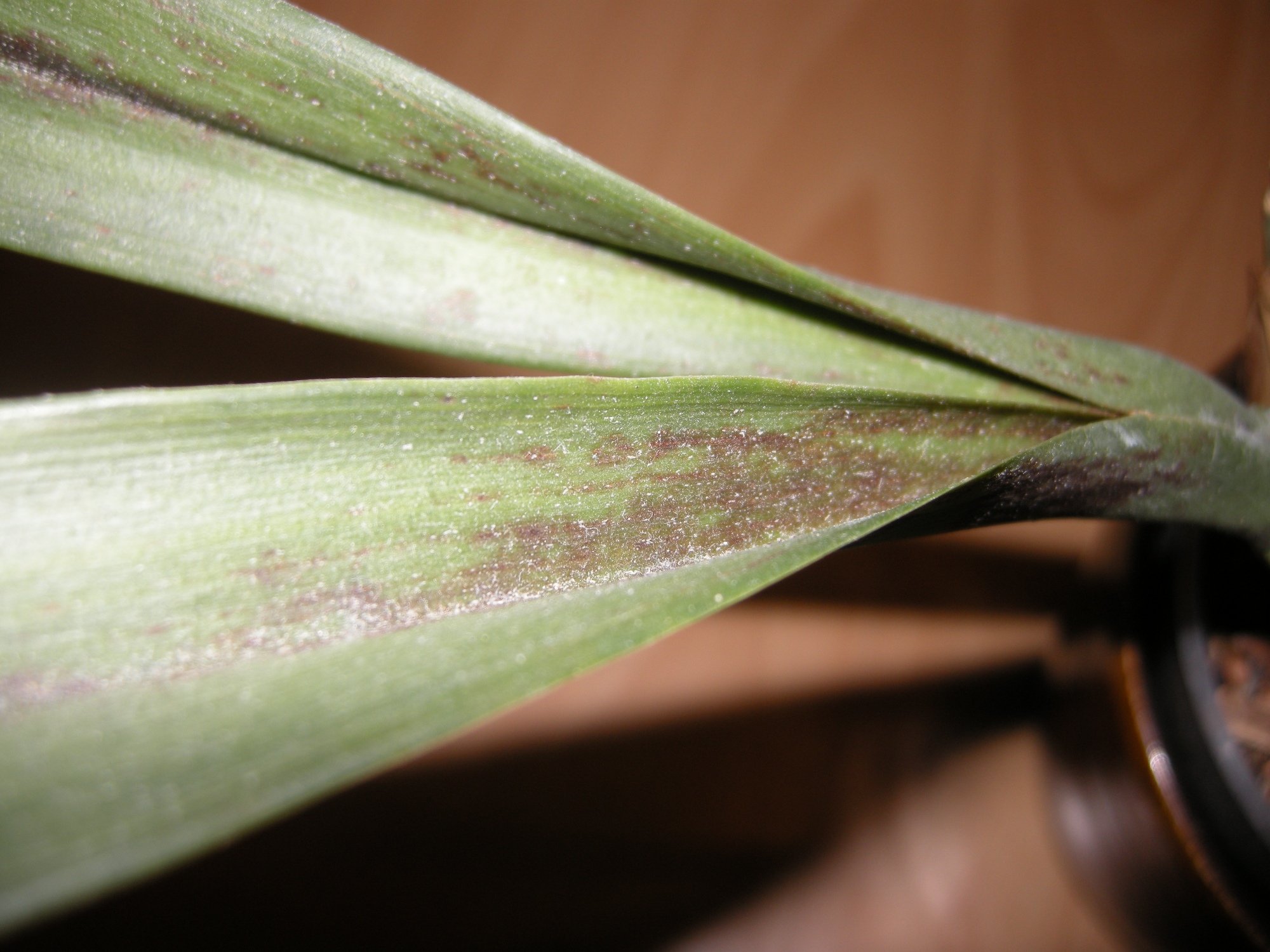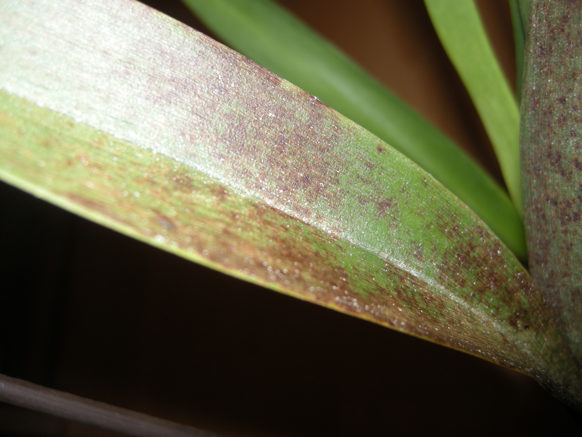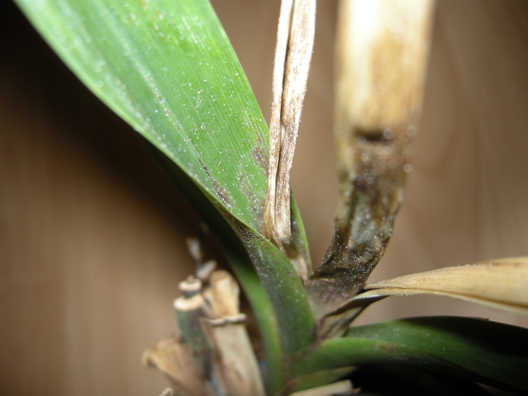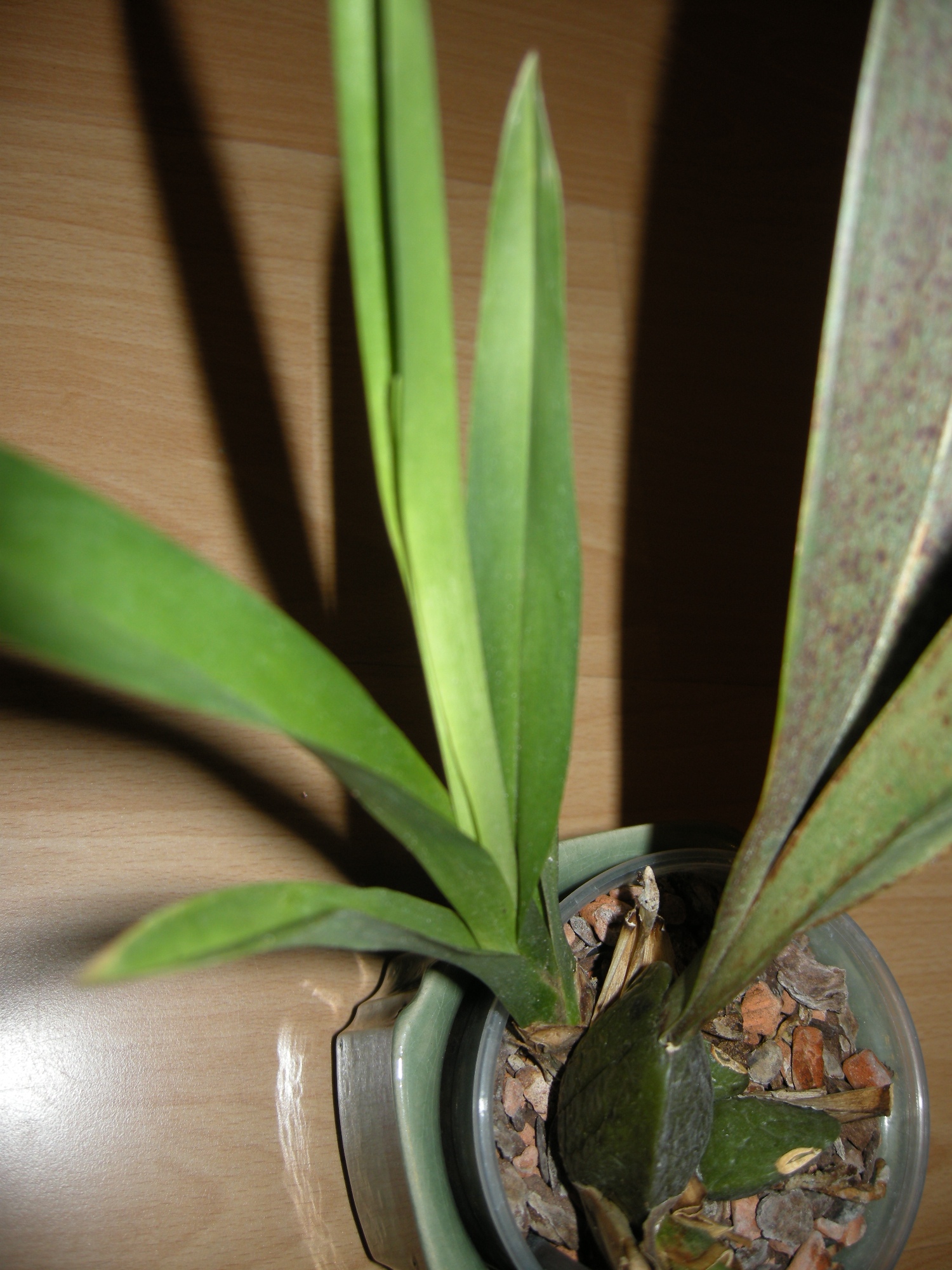 Dann eine Cymbidium, ich glaube die hat einen Virus oder so die hat nach der Kaufblüte nicht weiter geblüht, aber immer versucht einen neue Trieb zu bilden. Erst sehen die immer gut aus, dann kleben aber irgendwann die neuen Blätter so zusammen, dass man die auch händisch kaum außeinander bekommt. Die Blätter haben dann auch komische schwarze Flecken.