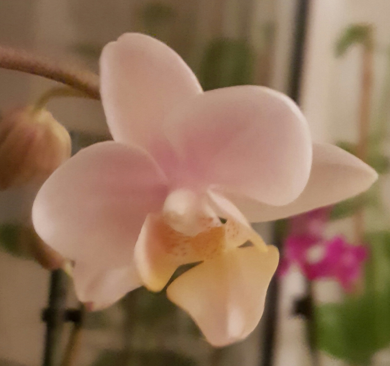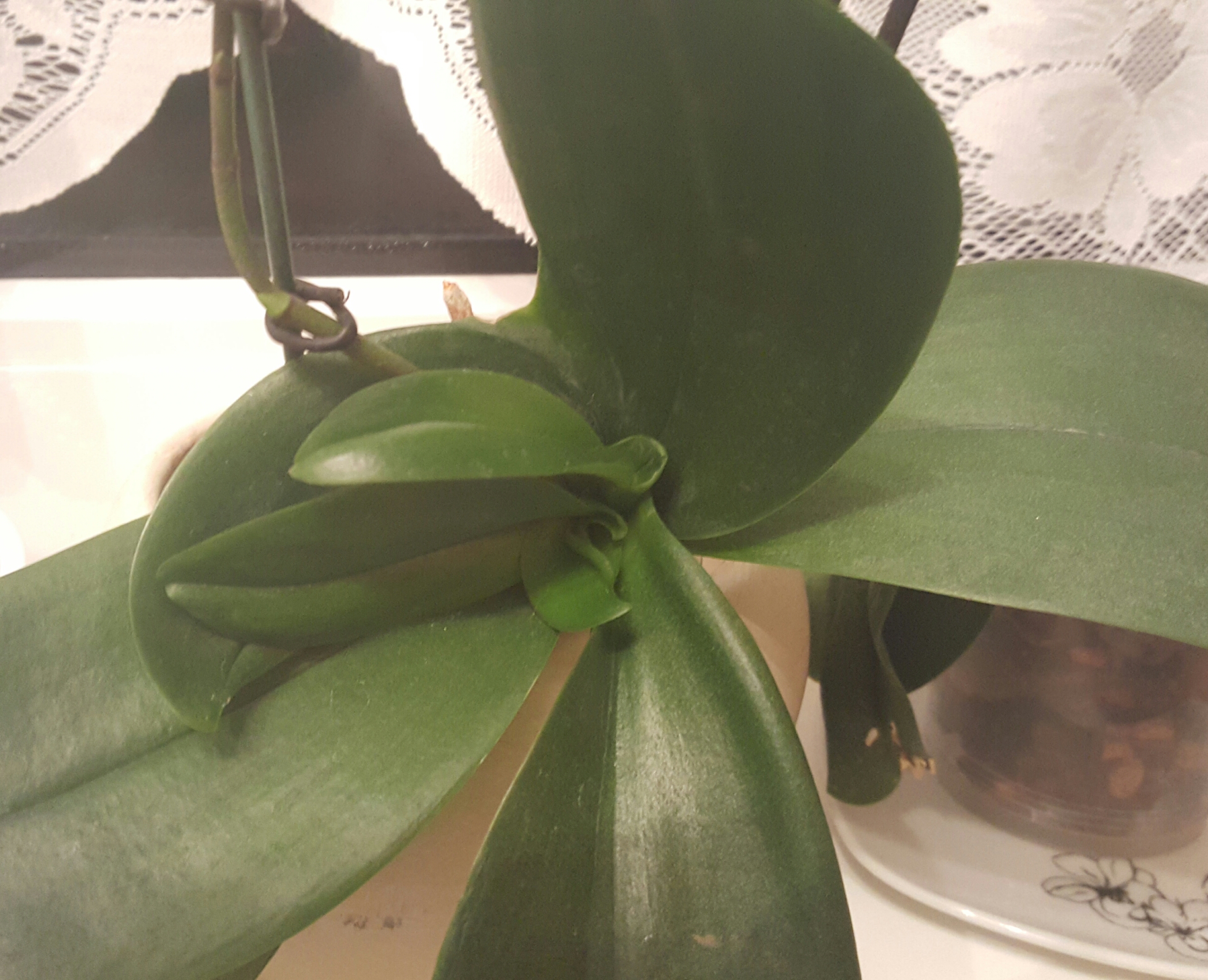 Außerdem hab ich wieder eine Orchidee von einer älteren Dame bekommen (die oben erwähnte Pflanze mit den Kindeln war auch von ihr). Sie war schon abgeblüht, aber die Dame kann mit Orchideen einfach nicht umgehen! Sie gießt und gießt und gießt sie leider immer zu Tode, denn sie kennt sich nur mit 'normalen' Zimmerpflanzen aus. Jedenfalls scheint es der Orchidee bei mir besser zu gehen, denn aus dem Nodium eines abgeblühten Triebes lugt eine frische grüne Knospe hervor. Bin gespannt ob es ein Trieb wird oder ein Kindel. Ich weiß leider auch nicht, welche Farbe die Orchidee hat, aber wahrscheinlich wieder weiß