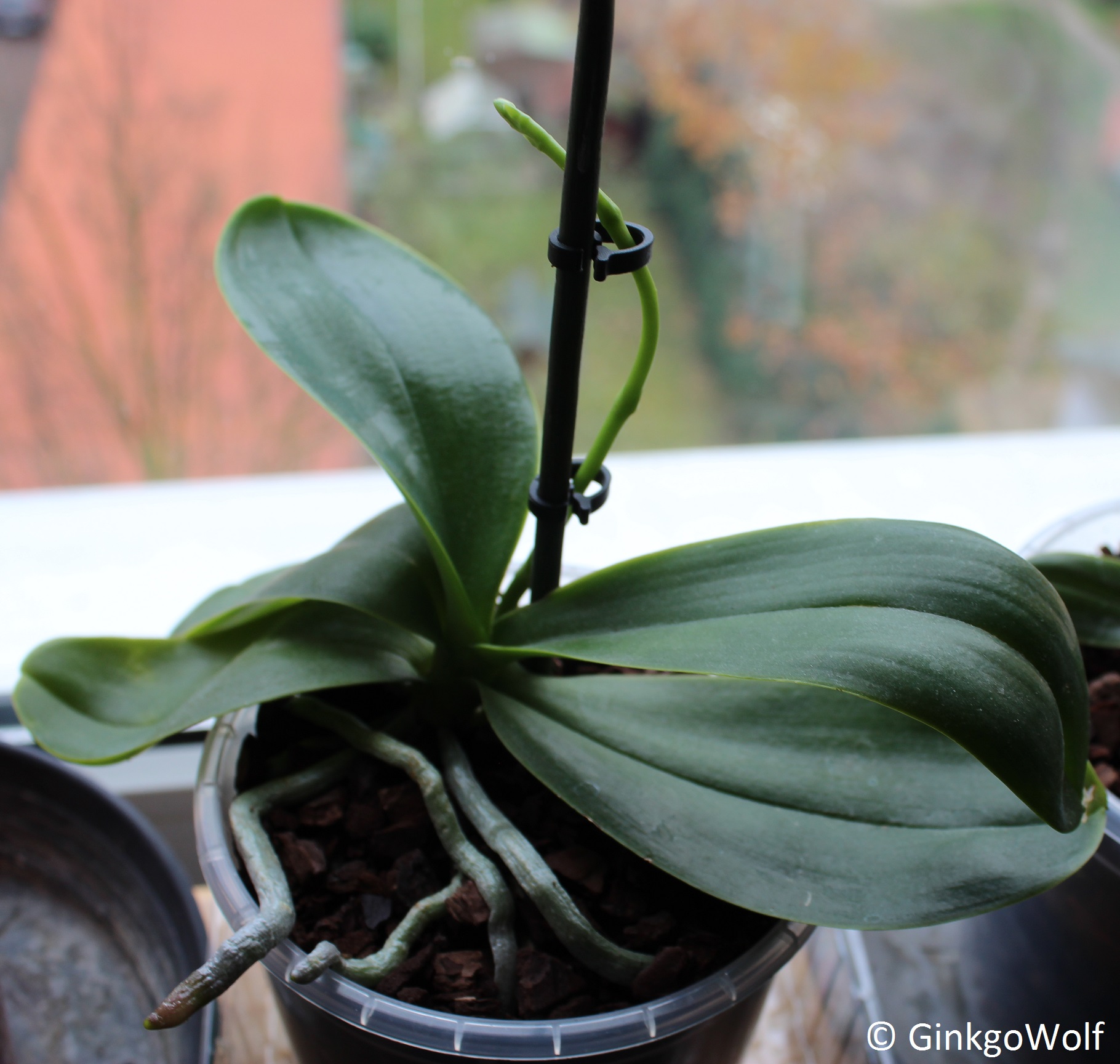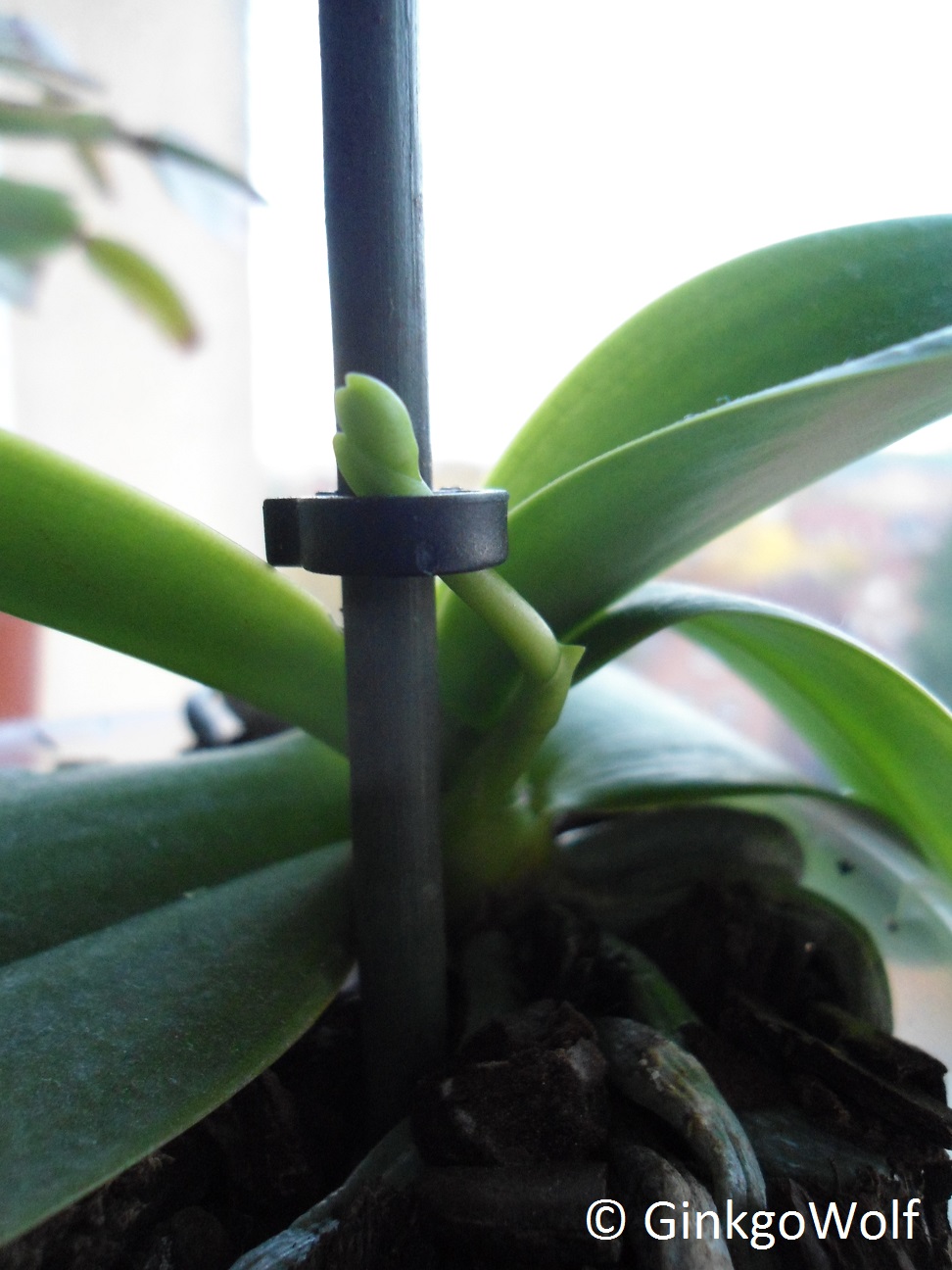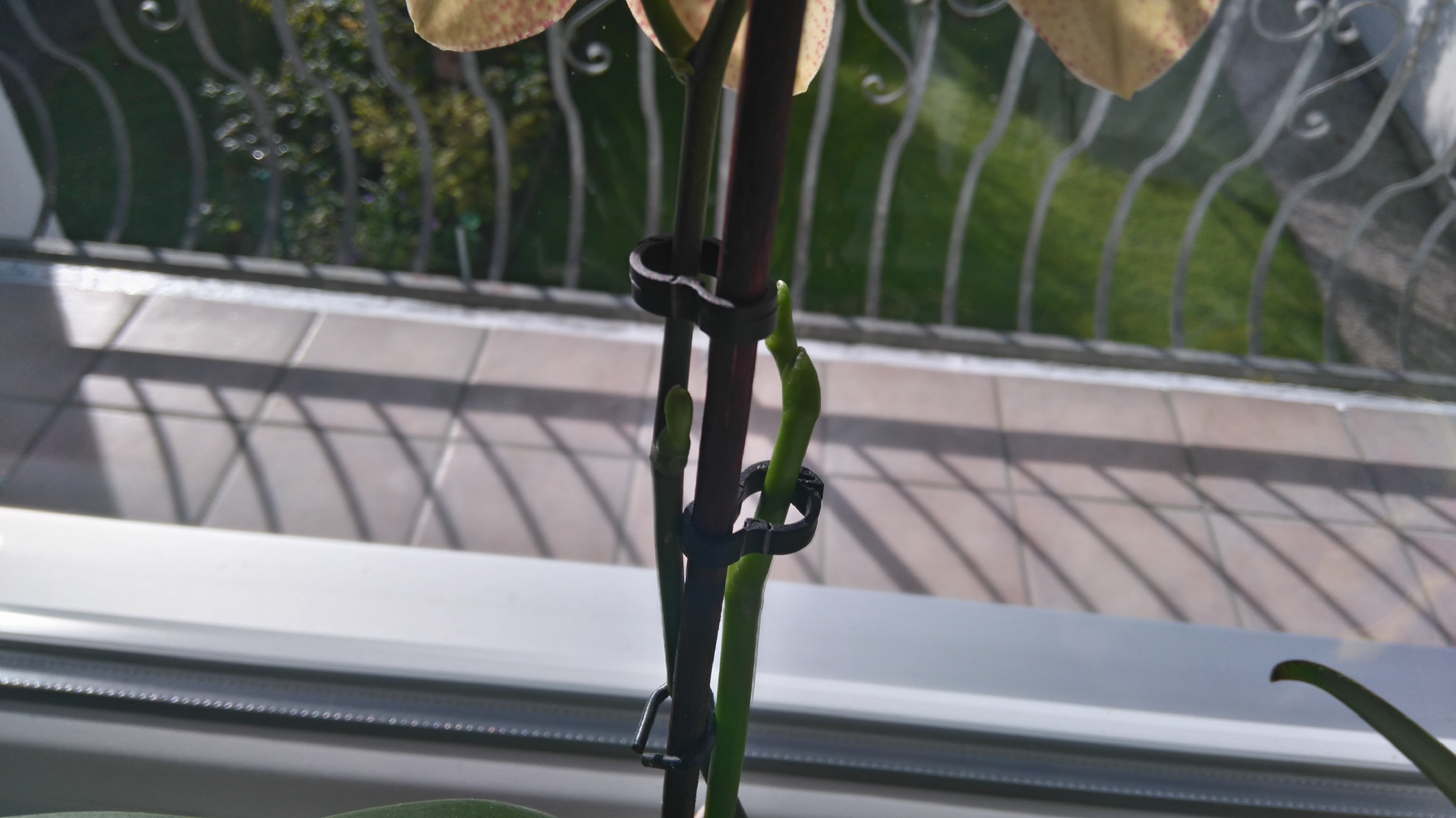 Ich hab den Stab auch extra auf diese Seite der Orchidee in den Topf gesteckt. Damit beim Befestigen der Trieb wirklich nicht abbrechen kann.
