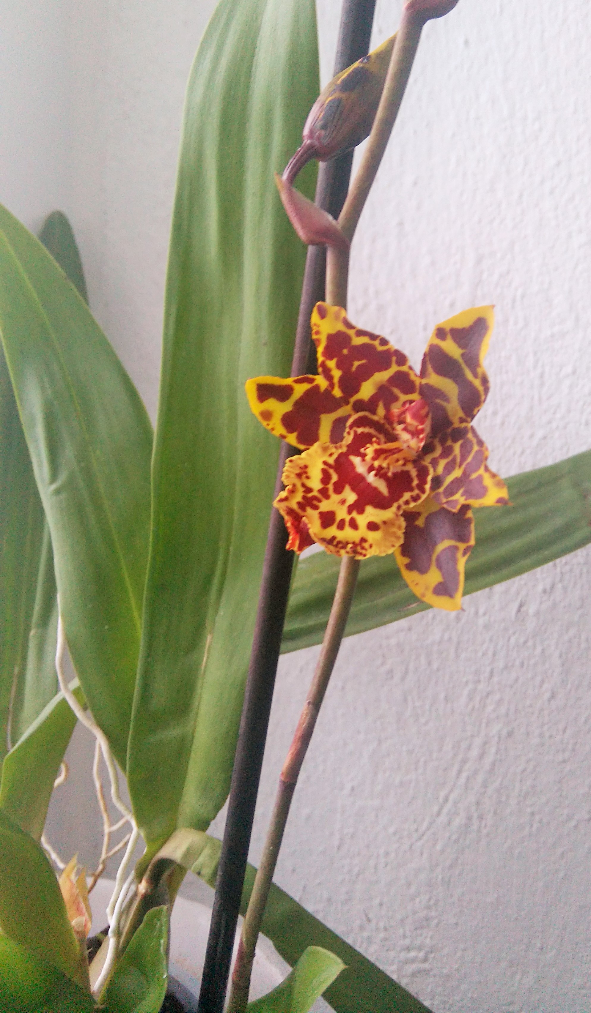 Und als Ersatz für meinen zuletzt verstorbenen Schlumbi ist eine von meinen "alt eingesessenen" Phals aus Eberswalde mit zu mir umgezogen, die mit der Blattmusterung und den zierlichen rosa-weißen Blüten. Die hat die letzten Jahre recht doll gelitten, die Blätter sind sehr lang geworden, sie stand wohl zu lange Zeit zu dunkel... Jetzt steht sie schön hell und ich denke, dass sie sich auch bald erholen wird.
