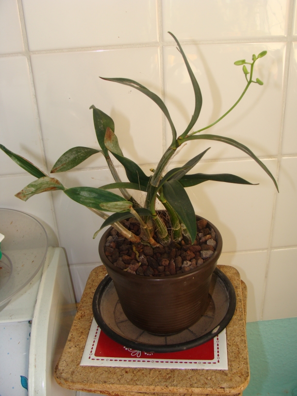 Das älteste Kindel blüht jetzt seit einiger Zeit und - ja, Esti, du hast es schon richtig vermutet - sie blüht weiß. Ganz hübsch, denn die Blüten selbst sind eher zierlich. Bisher hatte ich nur weiße Orchideen mit großen Blüten, da sind kleine Blüten in weiß mal auch ganz nett Bilder mach ich demnächst, jetzt ist leider schon zu dunkel.