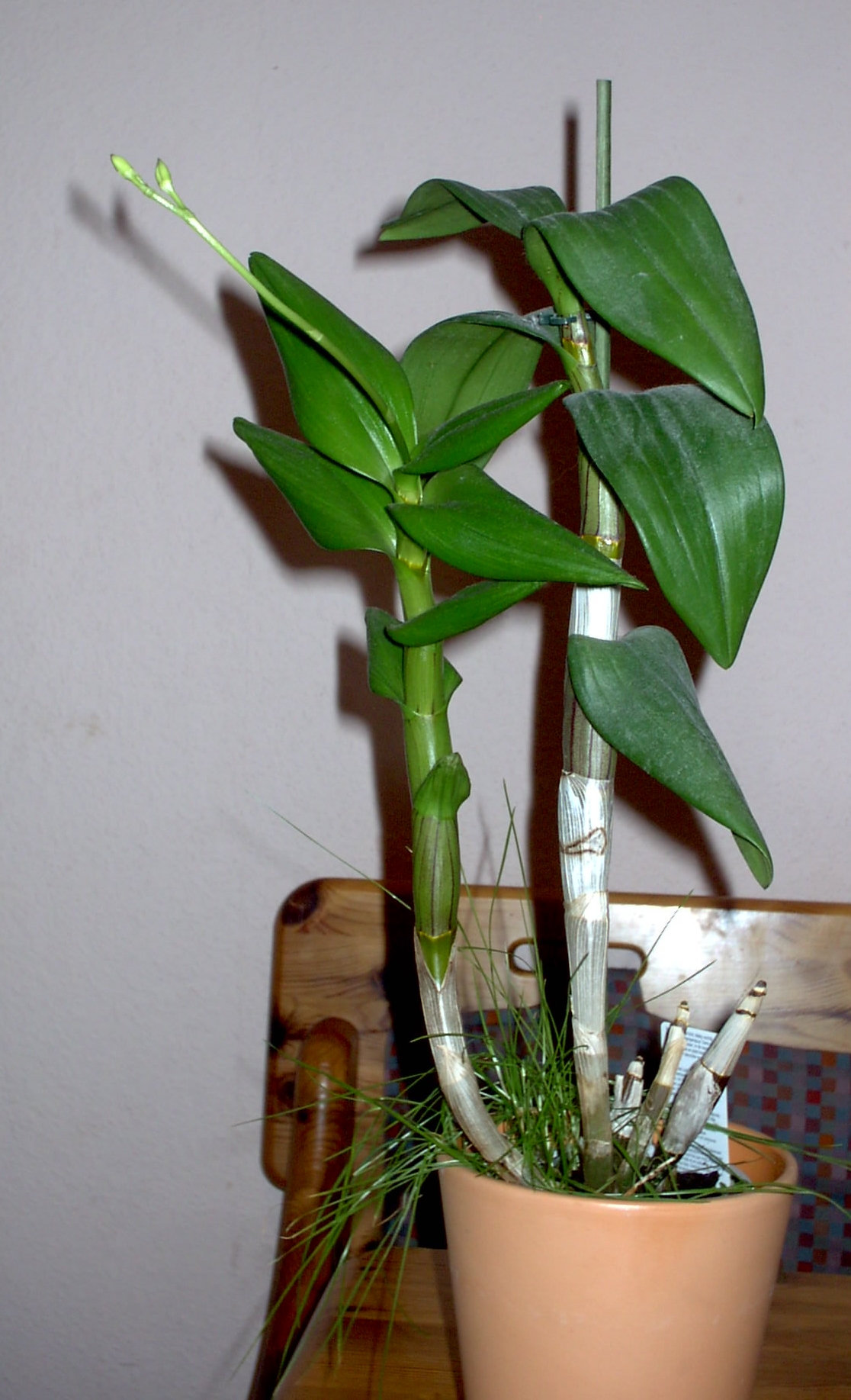 Das ist meine Neue, die hab ich jetzt seit zwei Wochen. Die muss ich erst mal aufpäppeln, alle Luftwurzeln sind vertrocknet, sieht nicht so gut aus, wird aber bestimmt bei guter Pflege ;-)