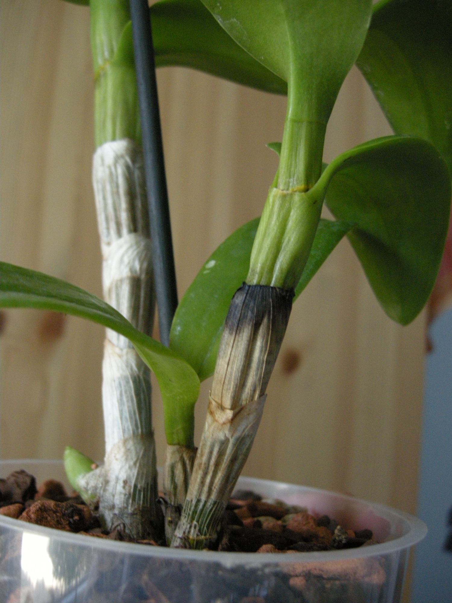 also als Sorgenkind würde ich sie nicht bezeichnen. Es ist völlig normal, dass die alten Bulben runzeln und irgendwann absterben. Das ist bei meinen auch so Deine Orchi (keine Phal) hat ja einen neuen Trieb bekommen . Wenn die runzligen Bulben dich stören, kannst du den Neutrieb mit einem scharfen Messer (desinfiziert mit Alkohol) abschneiden, die verletzte Stelle mit Zimtpulver behandeln und nach dem Abtrocknen in neues Substrat pflanzen.