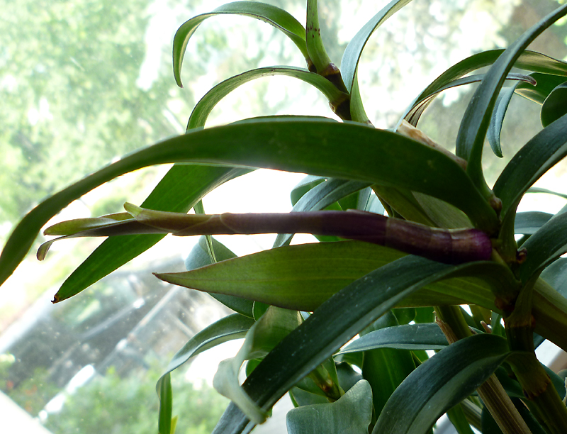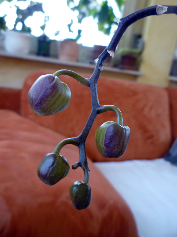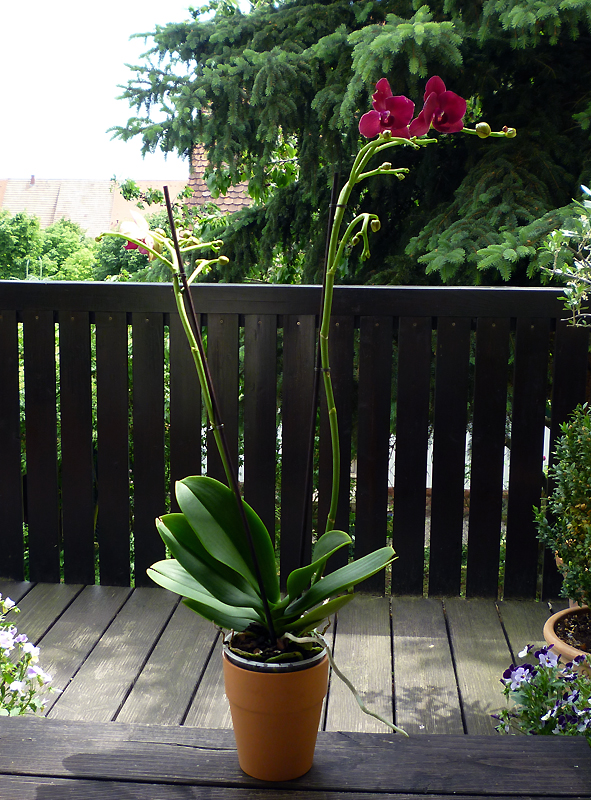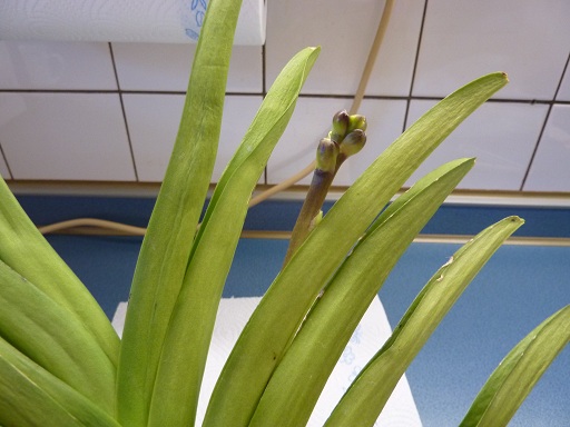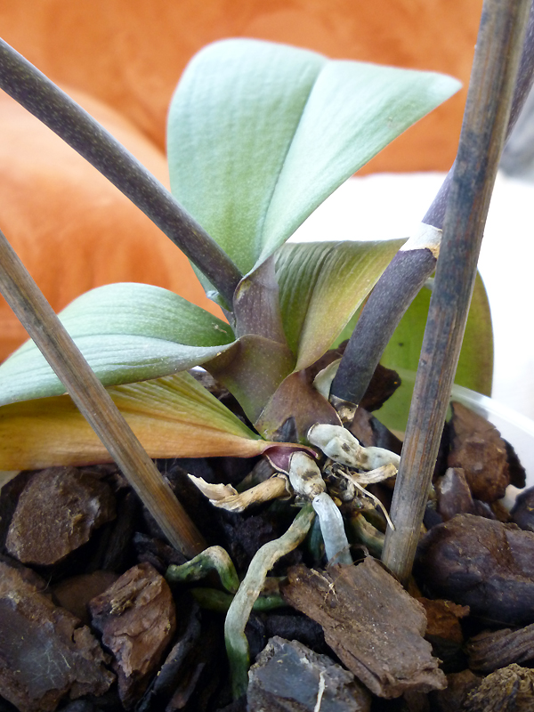 Dann habe ich noch eine Frage zu meiner Phal mit Herztrieb. Ich weiß nicht, warum, aber sie schiebt einen Seitentrieb am Herztrieb (er war unter einer Klammer und sieht deshalb noch etwas mitgenommen aus, aber das wächst sich aus), der eigentlich Trieb bekommt neue Knospen, ebenso der zweite Trieb. Sieht hübsch aus, aber die Blätter gefallen mir nicht, die unteren beiden werden gelb. Außerdem kommen mir die Wurzeln dünn vor.