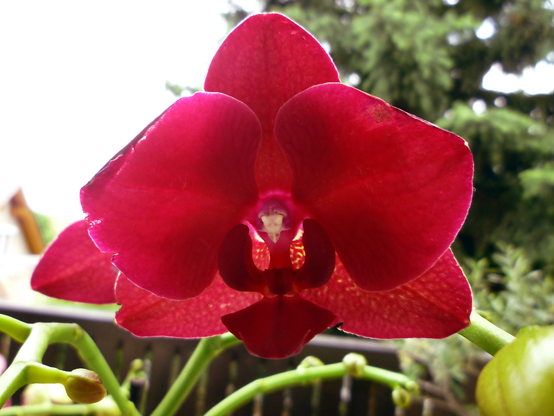 So, hier noch mal ein Bild von der Roten - nun mit mehr Licht. Die Farbe kommt fast hin. Die Pflanze hat zwei Triebe mit jeweils drei bis vier Seitentrieben mit Knospen. Ob da nicht Hormone im Spiel sind? Das ist ja der Hammer, was die schiebt - und das für 9,99 Euro...