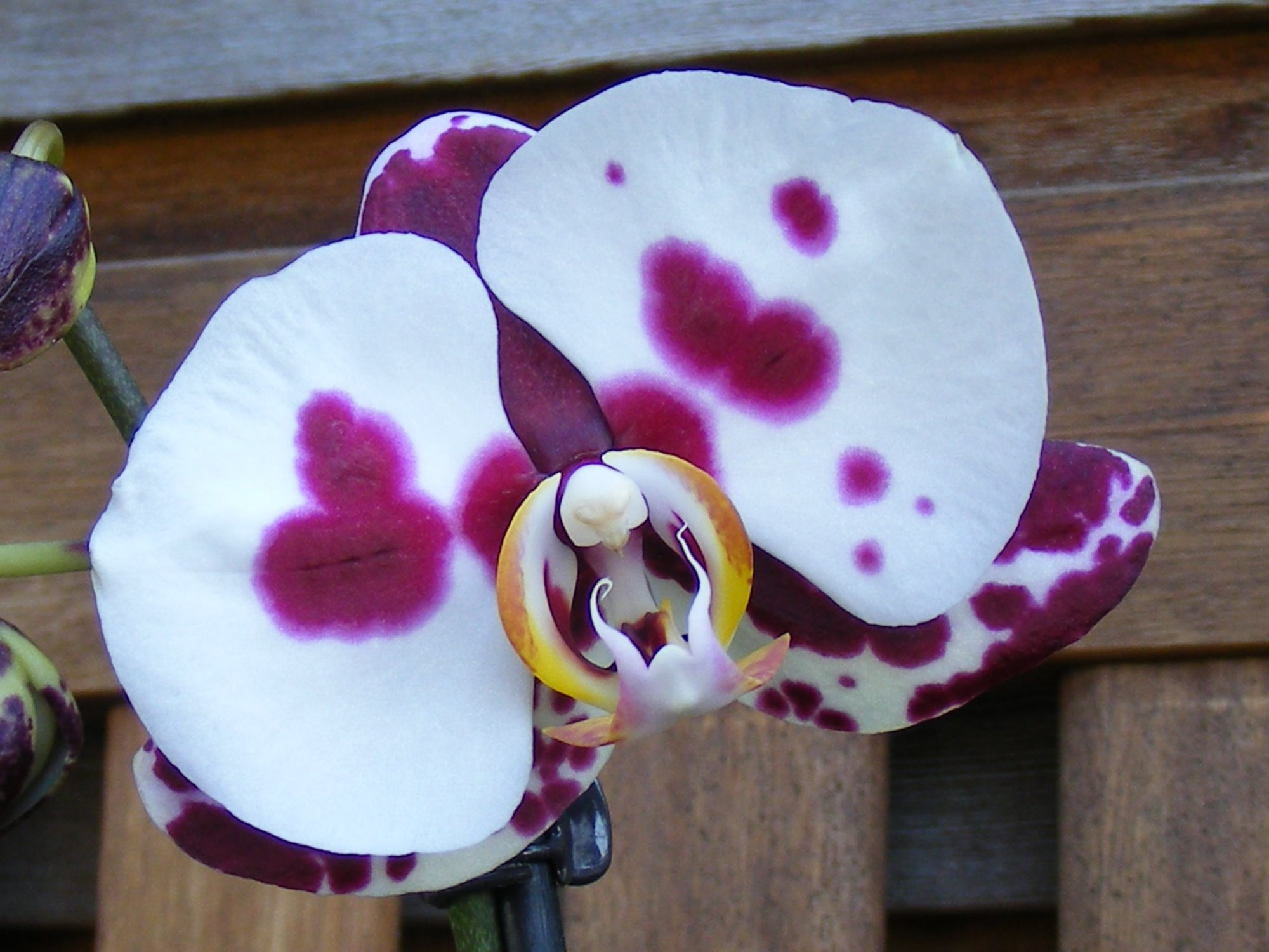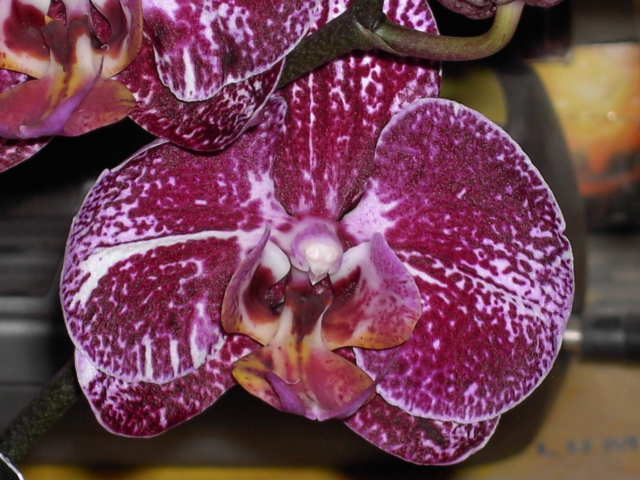 Phalaenopsis-Hybride weiß-dunkellila gepunktet - lila voll (mittlerer Steg & hintere Spitzen gelb) April 2011.JPG