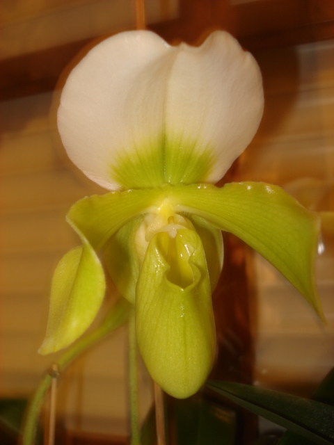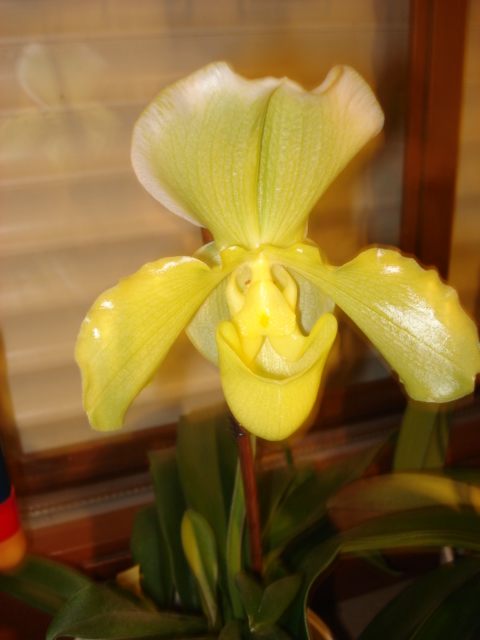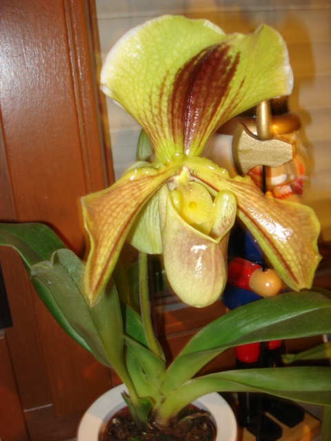 Meine abgeblüht gekaufte Frauenschuh-Hybride (Paphiopedilum Leeanum (insigne x spicerianum) ) blüht zum ersten Mal: