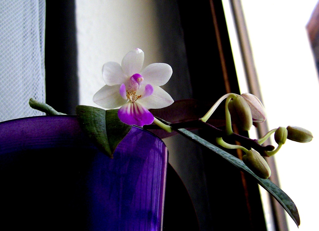 Rhynchostele (Lemboglossum, Odontoglossum) cervantesii. Beim Kauf fand ich diese Kombi gedanklich ganz interessant, das aber so ein Hammerteil daraus wird, hätte ich nicht erwartet. Im richtigen Licht ist die Blüte fast schwarz. Die Bilder im Netz von diesem Grex sind bei weitem nicht so schön.