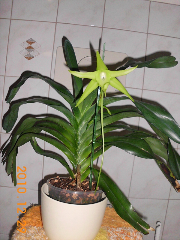 Hab sie da entdeckt, fand sie nett und hab zugeschlagen. Fand auch die gepunkteten Blätter so hübsch. Damals hatte sie 2 Blätter weniger als jetzt und noch keine Blüten. Im Winter tat sich nix, ab Frühjahr hat sie dann fleißig Wurzeln und neue Blätter geschoben und im Herbst erschien zu meiner riesigen Freude der Blütentrieb. Eine Equestris hab ich damals auch erstanden, mit Blütentrieb, der aber erwartungsgemäß den "Umzug" nicht überstanden hat, die hat also hier noch nicht geblüht. Die war auch noch deutlich jünger, schätze ich, die musste erstmal ein paar Wurzeln bilden. Bin gespannt, wie sie sich weiterentwickelt, vielleicht gibt es da ja nächstes Jahr Blüten.