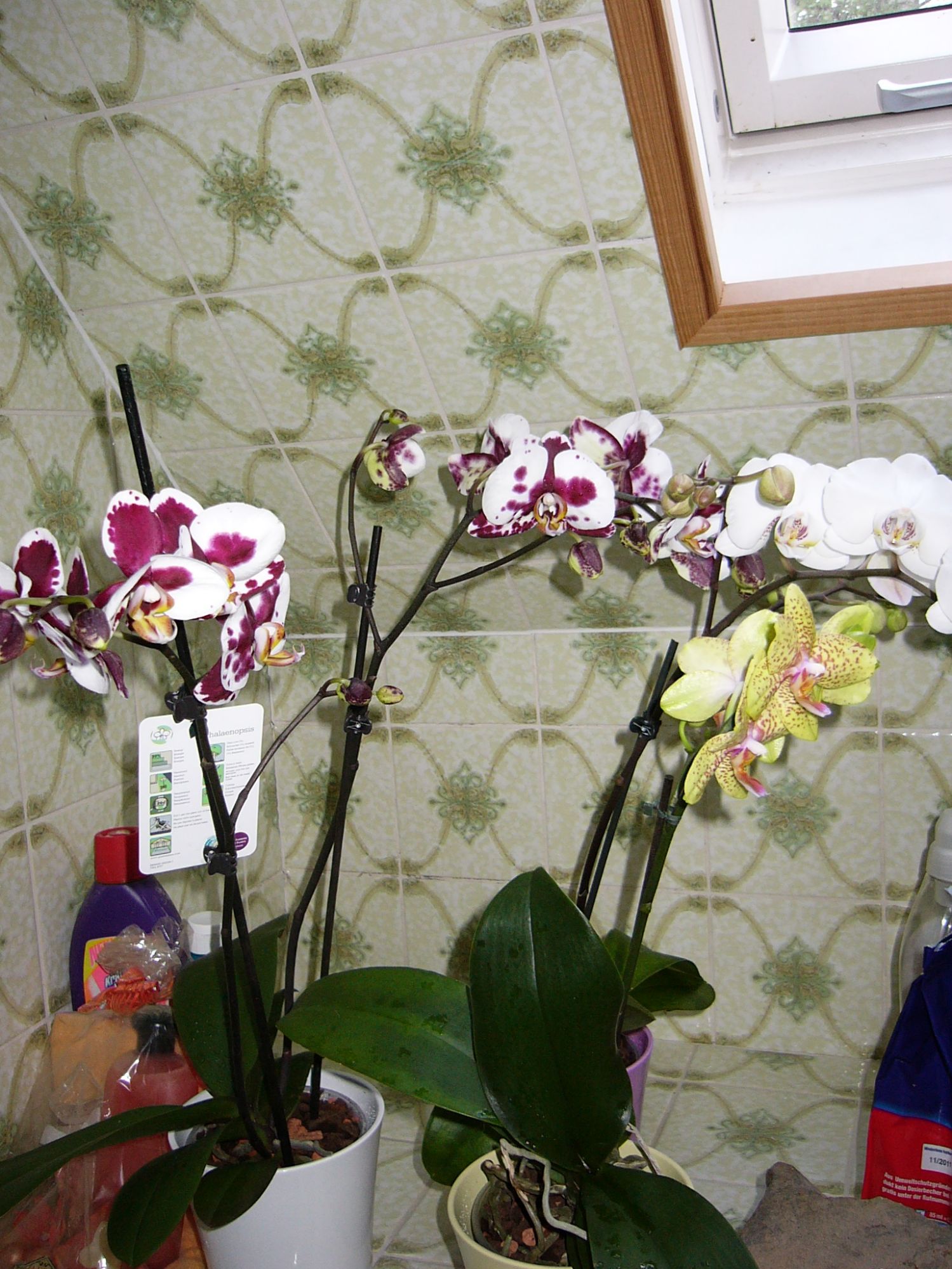 Durch dieses Forum bin ich echt süchtig geworden nach Pflanzen. Wir haben grade ein Haus gekauft und nur eine Palme mitgebracht. Jetzt wird alles begünt! Die Orchideen haben den Anfang für mein Badezimmer gemacht. Da soll ein richtiger Dschungel draus werden damit die häßlichen grünen Fliesen nicht so auffallen. Bis das Bad nämlich eine Sanierung erhält wird es wohl noch 5-6 Jahre dauern, bis das nötige Kleingeld dafür da ist!