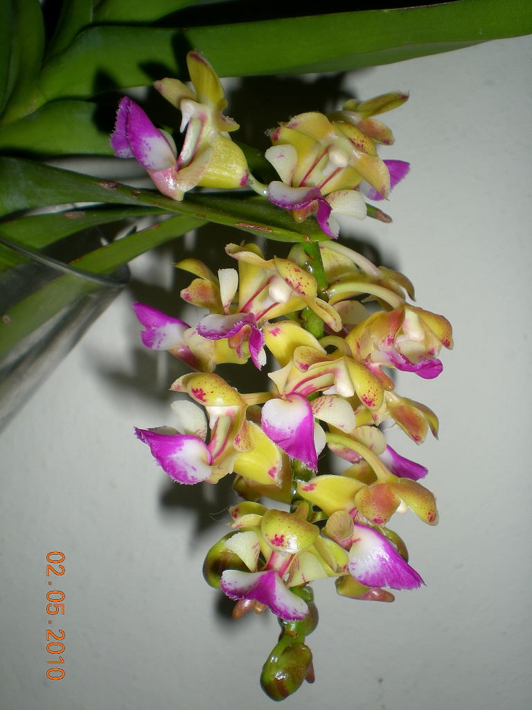 Hier mal noch 2 Bilder von meiner Aerides Houlletiana, so ziemlich voll erblüht. Sie steht im Küchenfenster. Die ganze Küche duftet ähnlich wie Zitronenverbene. Ich halt ständig meine Nase hin.