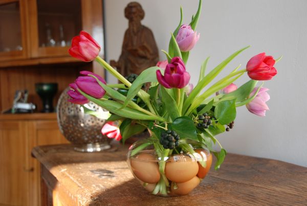 Geh an deinen Kühlschrank, greif dir die vorrätigen Hühnereier und fülle sie vorsichtig in eine Glasvase. Dann gieß dort Wasser hinein und staune darüber, wie sich die Eier optisch vergrößern und selbst die langweiligste Vase irgendwie gut aussieht. Zur Krönung und als eine fernösterliche Reminiszenz steckst du einige Blumen hinein, deren Stängel prima zwischen den Eiern Halt finden. Das ist so schlicht wie ergreifend und hat den Vorteil, dass du nach dem Abblühen der Blumen, die Eier wahlweise hart kochen, ausblasen oder einfach nur in die Tonne hauen kannst.