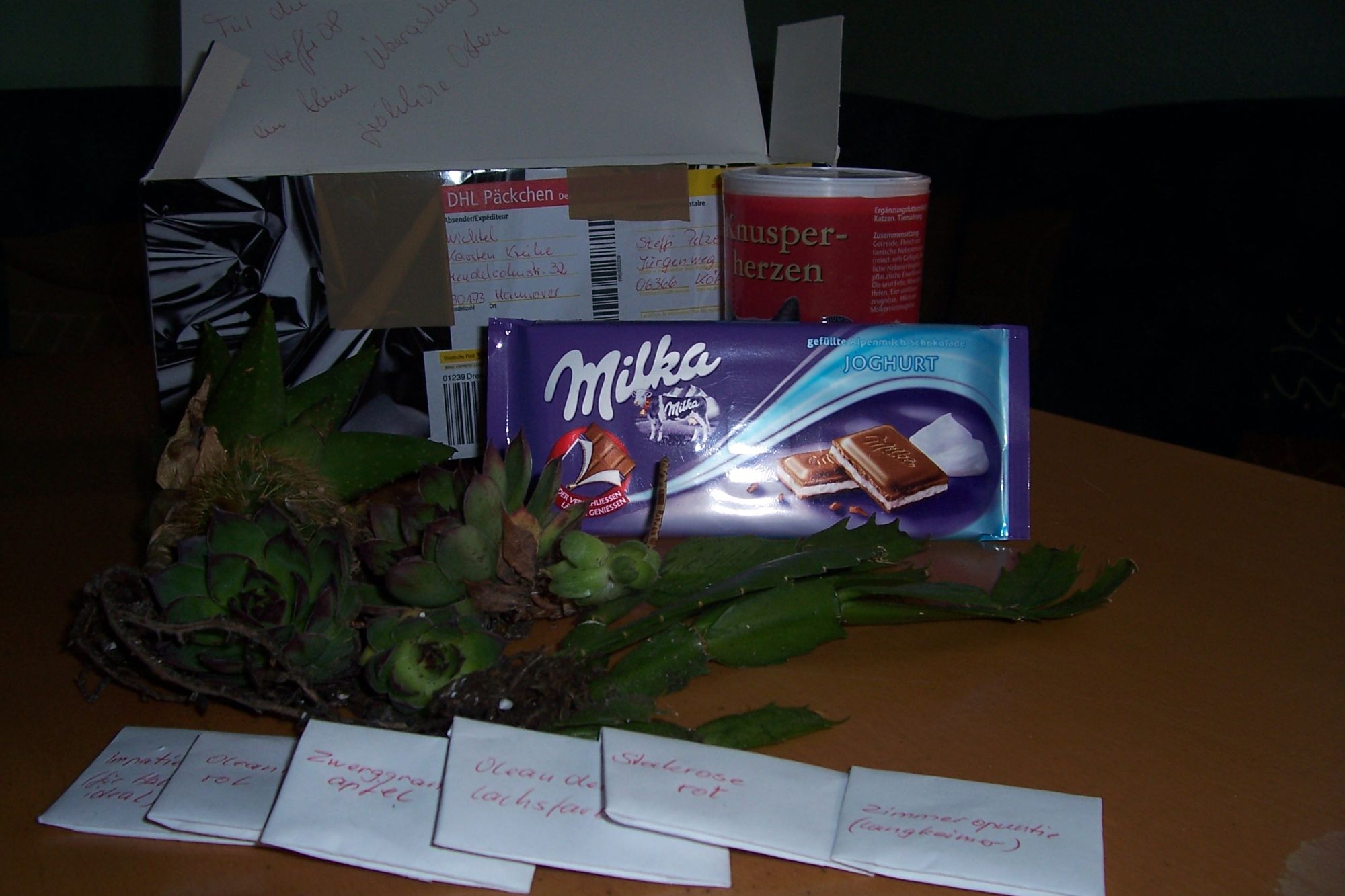 Ein riiiiesiger Luftpostbrief (ich würde sagen fast DIN - A3) lag im Briefkasten! Fachgerecht als Absender die Samenschatzkiste angegeben, damit der Inhalt nicht verloren geht, falls der Brief zurückgesendet werden muss. Mit Luftpost versendet Als ich ihn aufgemacht hab, war mein erster Eindruck: Ziemlich nass! es waren Steckies ín feuchten taschentüchern drinnen, darum war im brief Überflutung hat aber nichts gemacht, alles ist wohlbehalten angekommen. Die weitere Öffnung des Päckchens fand dann aber über der Abwasch statt