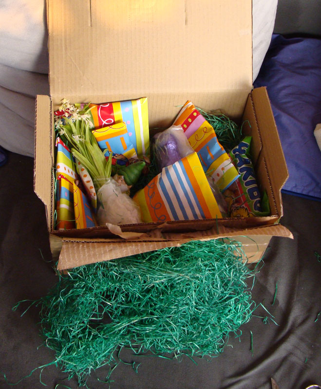 Das alles gespickt mit zwei kleinen Schokohasen, Haribo Baiser-Eiern (die habe ich als Kind geliebt) und einem Schmunzelhasen, der die Reise auch heile überlebt hat. Ach ja, und der niedliche kleine, grüne Gartenzwerg nicht zu vergessen.