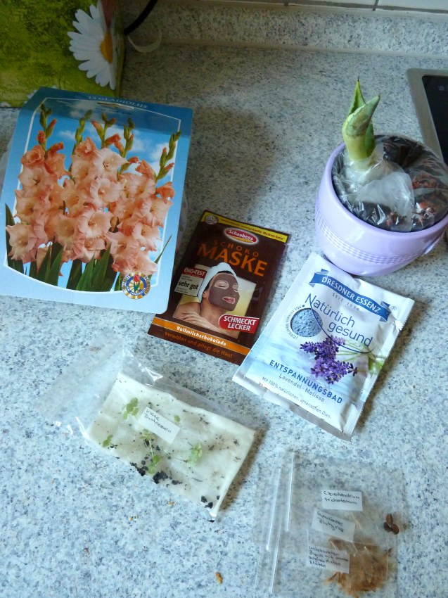 Bin gerade am Kochen und staune über das riesige Päckchen - nach dem Essen werd ichs begutachten und beim Kaffee dann noch mal schreiben was ich so bekommen hab