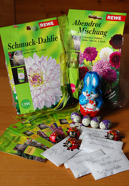 Zuerst habe ich die Samen ausgepackt und mich total gefreut! Woher wußtest DU denn daß ich Luffa und Baumwolle schon recherchiert habe und auf meiner Habenwollenlise hatte? Meine Zantendeschia ist mir ja leider den Winter über kaputt gegangen, daher kann ich den Samen super gut brauchen, auch noch so eine hübsche!!!