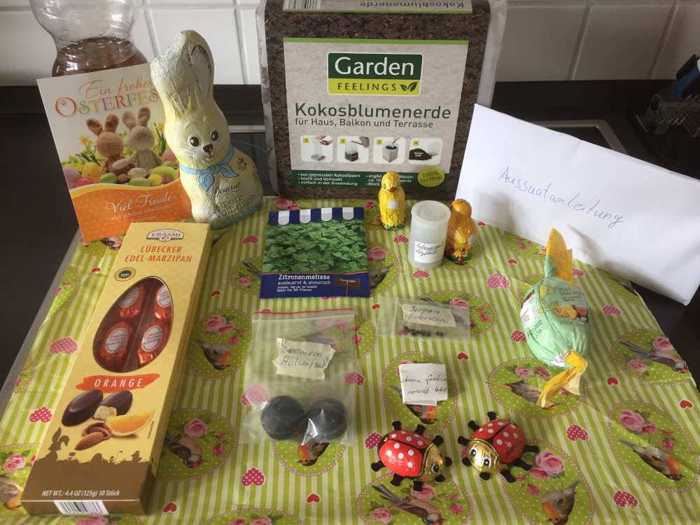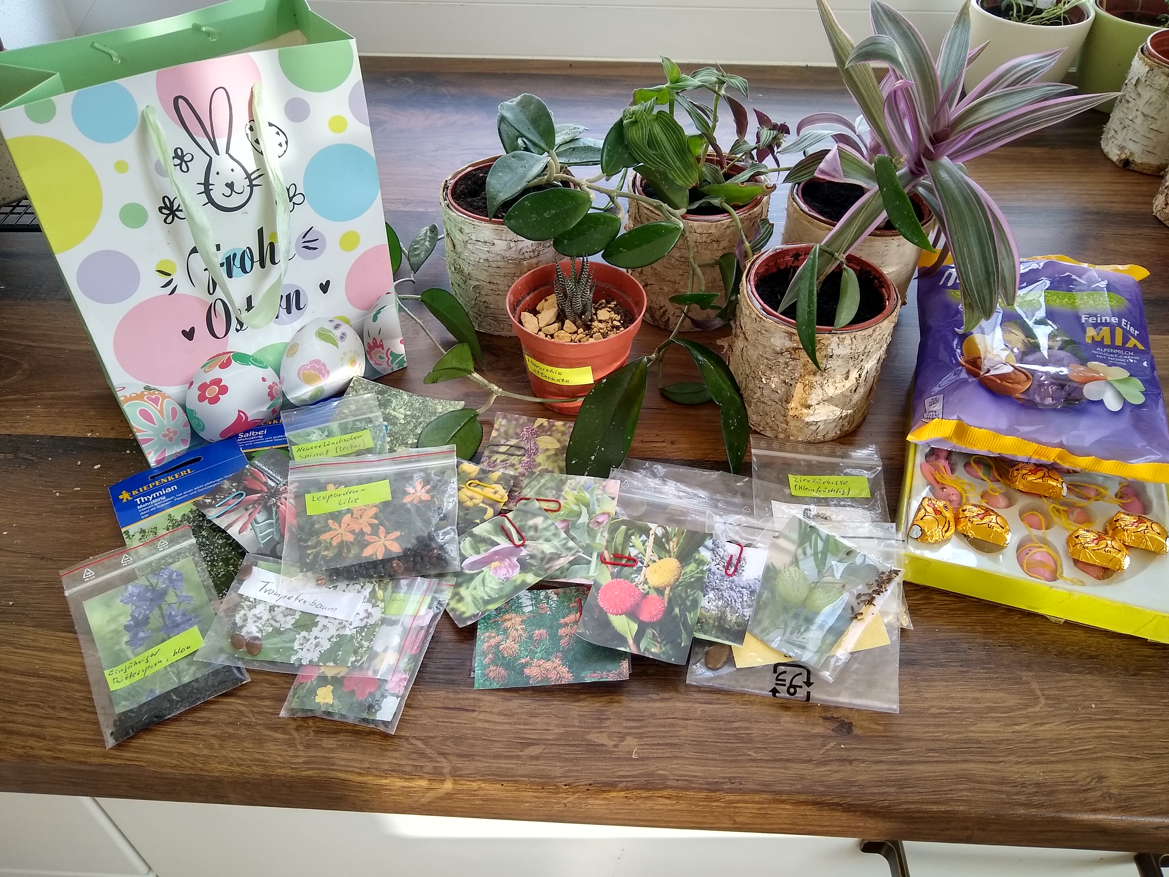 Hallo mein lieber Wichtel, alles gut, kannst beruhigt sein. Eben kam die Wichtelpost mit einem Riesenpaket! Mann, ich bin ja platt! Hab es gleich geöffnet und freue mich sehr. Alles ist noch fit und sieht super aus. Doch sag mal, was ist das für ein Zwiebelgewächs? Maiglöckchen und Bärlauch scheiden schonmal aus. Bei dem Kaktus bin ich mir auch nicht sicher, ob es eine Rhipsalisart ist und das niedliche im Töpfchen ist das ein Elefantenohr oder vielleicht eine Klivie? Bitte klär mich auf, damit ich es auch richtig pflegen kann. Sedum und Efeutute kenne ich. Du hast alles sehr gut verpackt und ich danke dir. Das bunte Päckchen bleibt wie versprochen noch zu bis morgen.Werde dann wieder berichten.