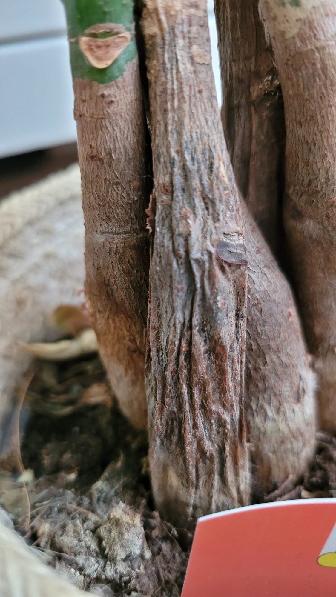 Wenn sich dir Rinde sowieso löst würde ich die mal abkratzen( vorsichtig). Ich gehe davon aus das da Fäulnis drunter ist. Die Pflanzen sind Verflochten? Das ist nicht gut....