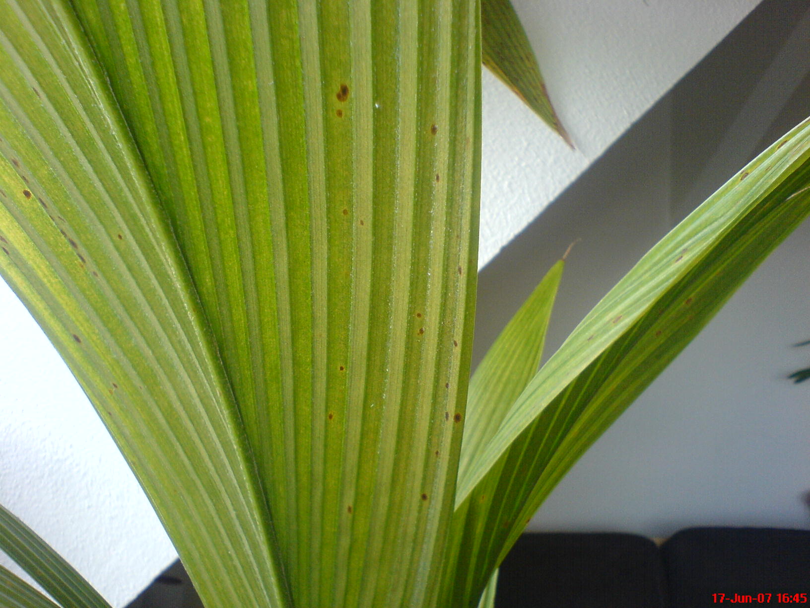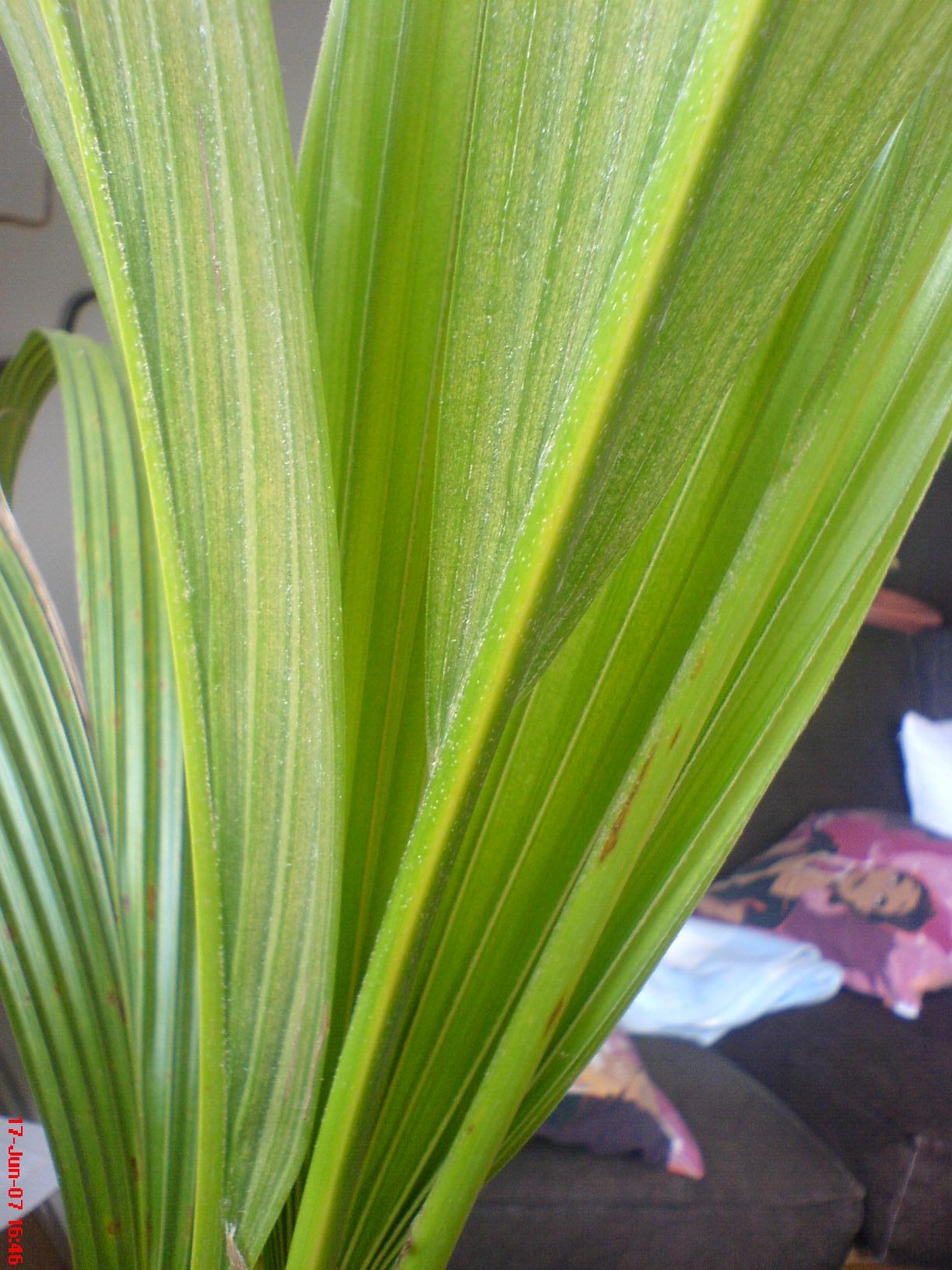 Mit etwas Glück bildet eine neu gekaufte Cocospalme neue, kräftige Wurzeln aus, wenn man sie sofort nach Kauf in einen ausreichend großen Kübel pflanzt. Auf Düngung sollte in den ersten beiden Jahren verzichtet werden, weil die Nährstoffe sowieso der Nuß entnommen werden und danach das Substrat genügend Nährstoffe liefert. Achten Sie unbedingt auf Thripse und Spinnmilben! Beide Schädlinge machen sich besonders bei trockener Luft breit, sind selbst für das geübte Auge fast unsichtbar und können trotzdem innerhalb weniger Wochen eine Palme zum Absterben bringen. Wenn Wedel gelb werden oder gar vertrocknen, sollte man diese eingehend auf Schädlinge untersuchen. Es sei aber nicht verschwiegen, daß in größeren Zeitabständen bei gutem Wachstum die jeweils untersten Wedel in größeren Zeitabständen absterben. Weniger als 5 gesunde Wedel besitzt eine Cocospalme aber unter normalen Umständen nie. Eine silbrig glänzende oder stumpfe Blattoberfläche ist immer ein Alarmzeichen.