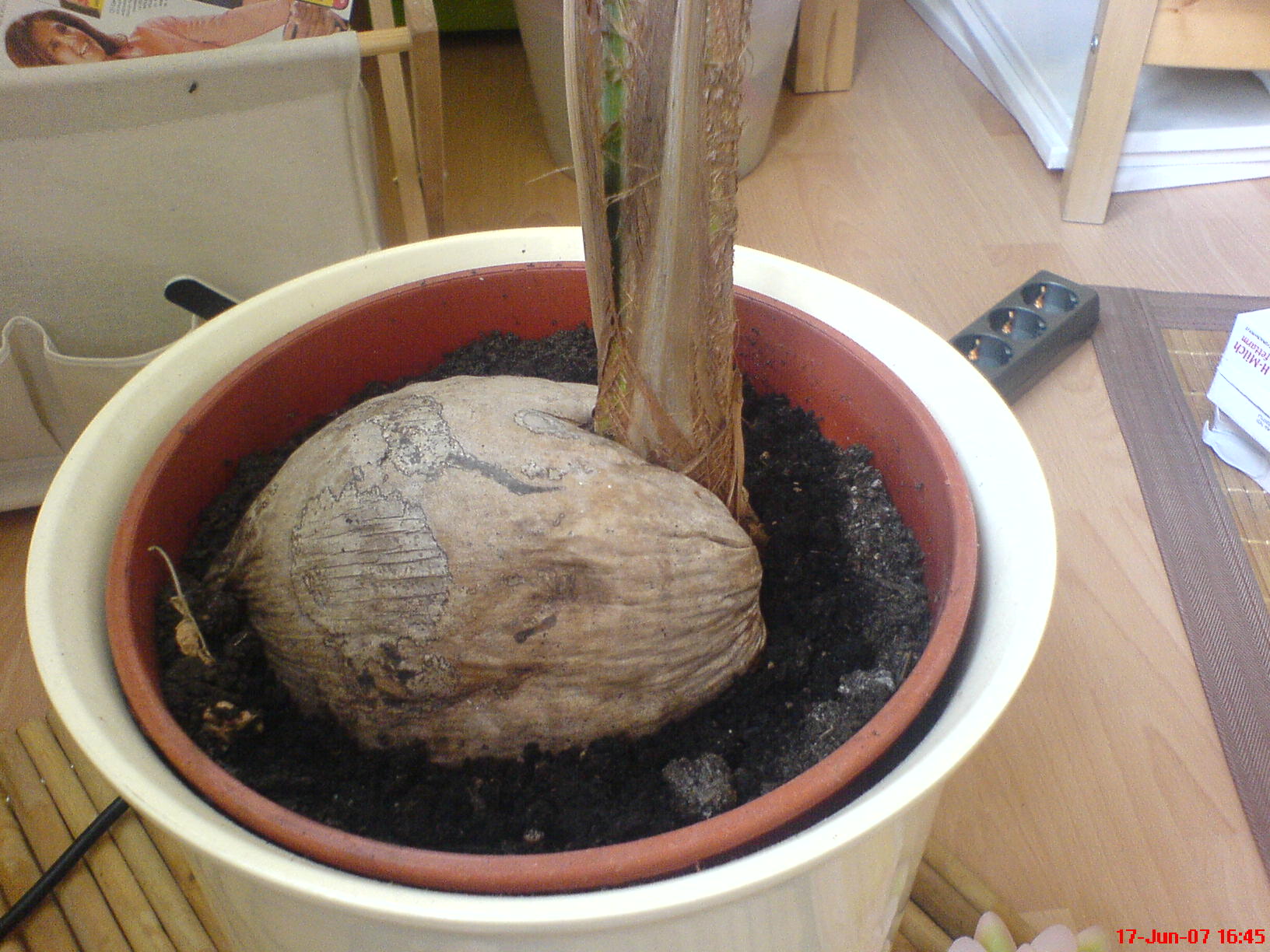 Sonstiges: Cocospalmen bilden -wie andere Palmen auch- zuerst Sämlingsblätter aus. Diese sehen bei Cocos nucifera V-förmig aus wie ein Vogelschwanz und erreichen locker Mannshöhe. Dies vor allem dann, wenn die Palme nicht sehr hell steht (d.h. leichte Vergeilung). Die Bildung adulter d.h. gefiederter Blätter erleben viele Cocospalmen vor allem deshalb nicht, weil sie ihr kurzes Leben in viel zu kleinen und vor allem zu niedrigen Töpfen fristen müssen. Nach allerspätestens 2 bis 3 Jahren seit Keimung ist der Nährstoffvorrat in der Nuß verbraucht. Leider kommen Cocospalmen fast immer mit abgeschnittenen Wurzeln in den Handel, weil sie nämlich die winzigen Töpfe sprengen würden. Schauen Sie sich ruhig einmal die Abzugslöcher der Töpfe an; dort sieht man oft die Reste der durchtrennten, dicken Wurzeln. Die Palme geht unweigerlich ein, wenn sie nicht bis dahin kräftige Wurzeln gebildet hat. Reichliche Düngergaben als Abhilfemaßnahmen verschlimmern infolge Substratversalzung das Problem nur.