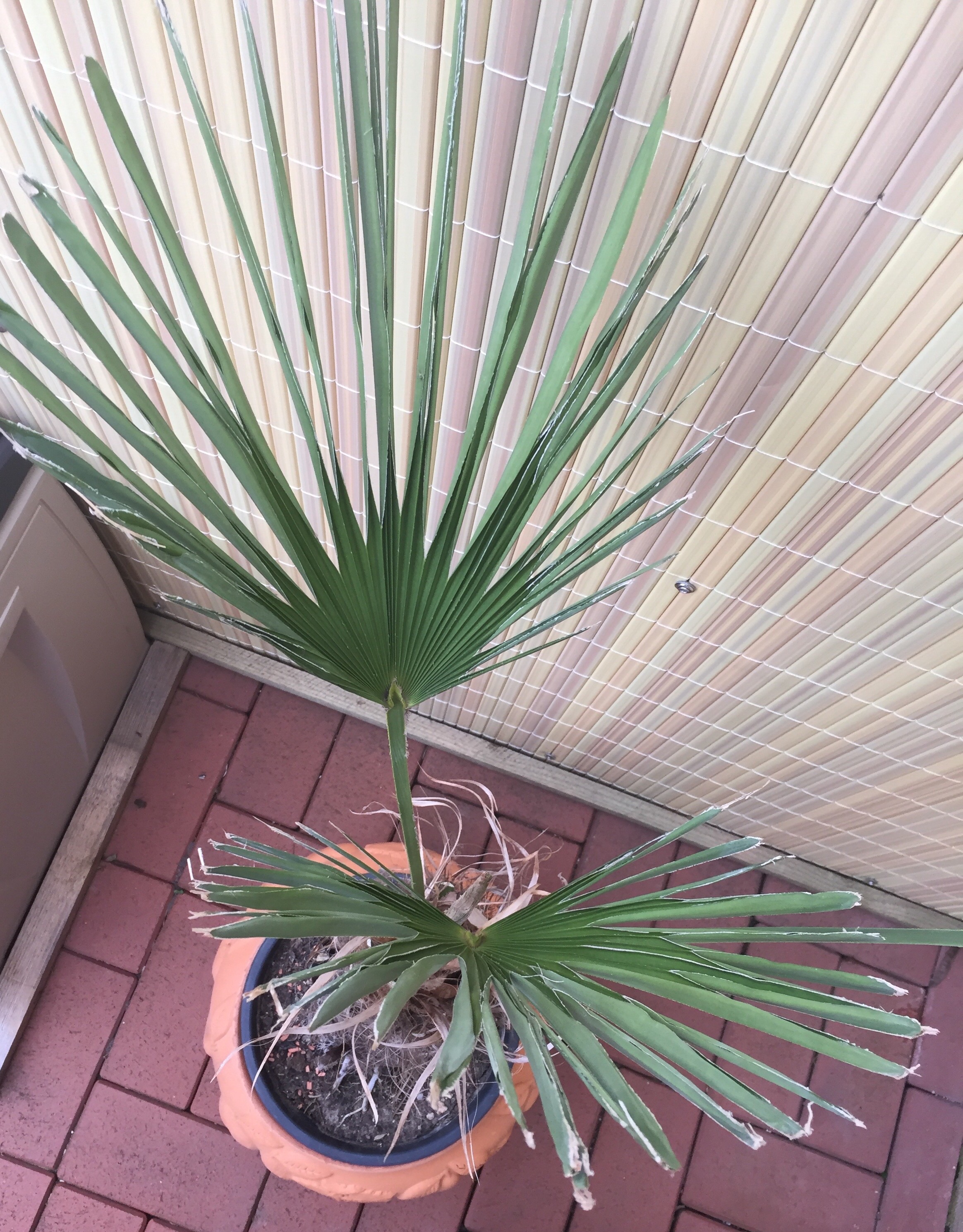So nun hier ein paar Bilder von der Palme die nun seit ein paar Tagen auf der Terasse steht.