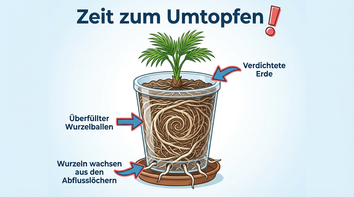 - Der Topf platzt aus allen Nähten: Wenn Sie die Palme anheben und der Wurzelballen steinhart und von Wurzeln durchzogen ist, spricht man von einem "wurzelgebundenen" Zustand. Die Pflanze braucht dringend mehr Platz.