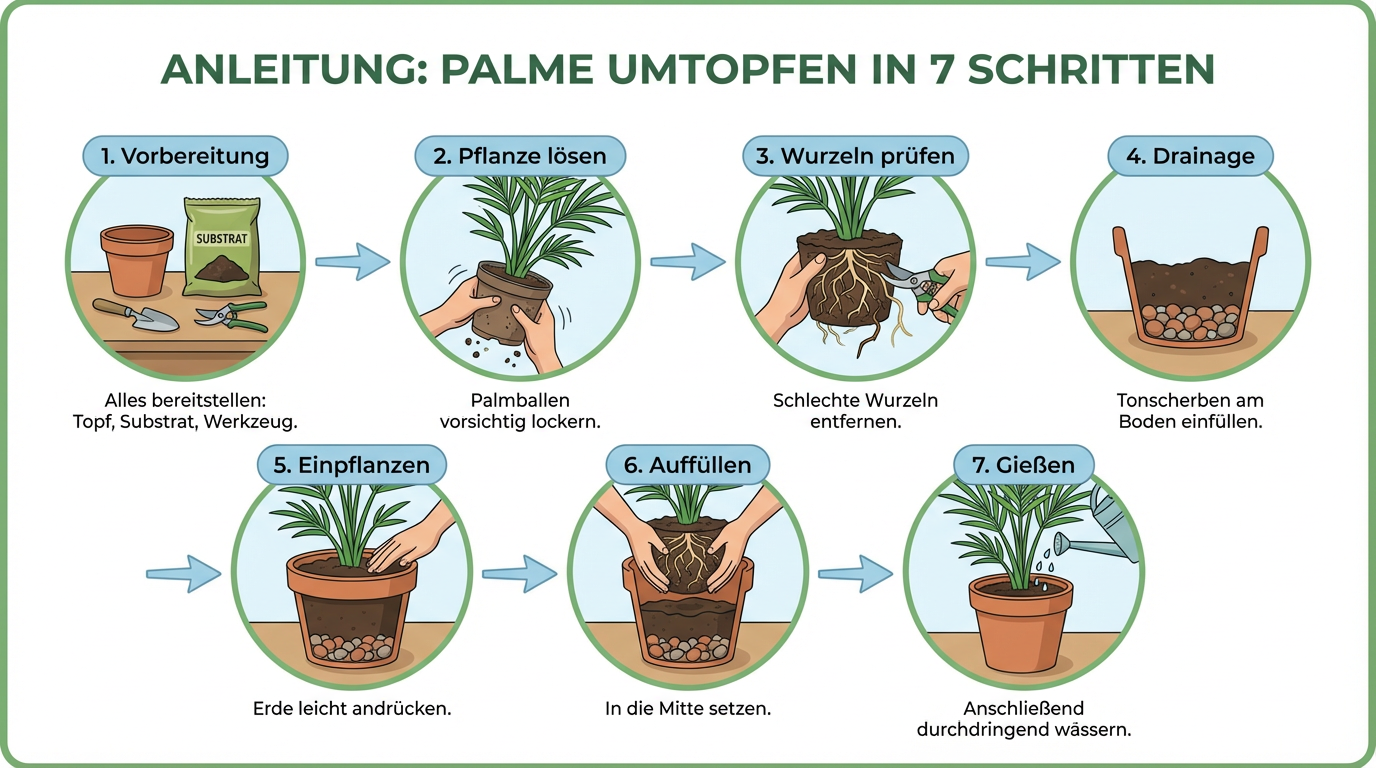 Stellen Sie sich vor, Sie sitzen gemütlich bei einer Tasse Tee und unterhalten sich mit einem guten Freund, der zufällig ein ganzes Team von Pflanzenexperten im Rücken hat. Genau so soll sich diese Anleitung anfühlen. Das Umtopfen Ihrer Palme ist kein Hexenwerk, sondern eher wie ein liebevoller Umzug für Ihre Pflanze. Viele haben davor Respekt, weil sie Angst haben, etwas falsch zu machen. Diese Sorge möchten wir Ihnen nehmen. Mit ein paar einfachen Handgriffen und dem richtigen Wissen wird Ihre Palme den Umzug nicht nur überstehen, sondern prächtig gedeihen.