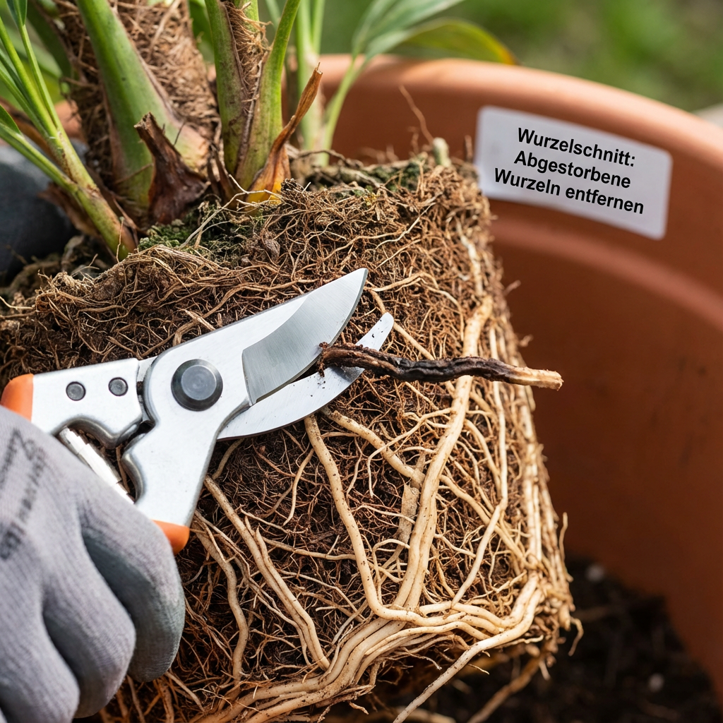 Befreien Sie die Wurzeln sanft von der alten Erde. Lockern Sie den Ballen mit den Fingern etwas auf. Wenn Sie verfilzte oder braune, abgestorbene Wurzeln entdecken, können Sie diese mit einer sauberen Schere entfernen. Aber bitte mit Gefühl!