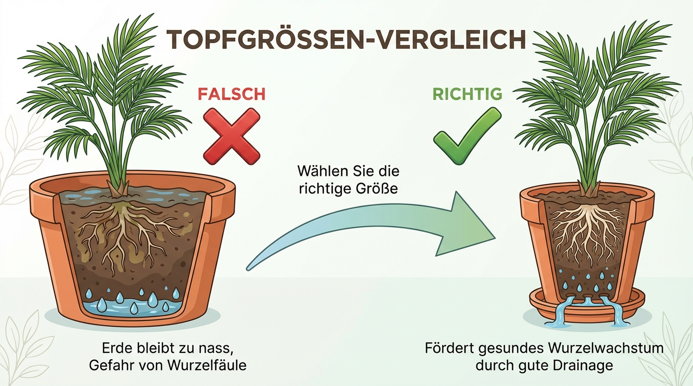 Ein riesiger Topf speichert zu viel Wasser, was zu Wurzelfäule führen kann. Ein Zuwachs von 2-4 cm im Durchmesser ist ideal.