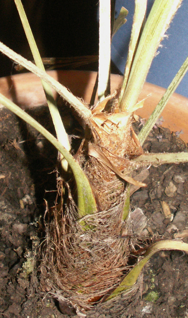 Palme Nummer 1 haben wir letzten Sommer gekauft, sie ist eigentlich für den Garten gedacht, muss jedoch überwintert werden. Im Garten ging es ihr gut, es hat regelmäßig geregnet, so dass sie sogar ein, zwei neue Wedel bekommen hat. Als wir sie dann aber im Oktober/November reingeholt haben ins Haus (Süd-Fenster; Temp. 18°-20°C) sah sie nach ein paar Wochen so aus, wie dort unten (ersten beiden Fotos)