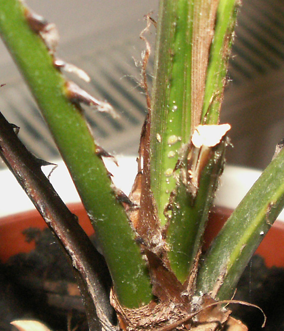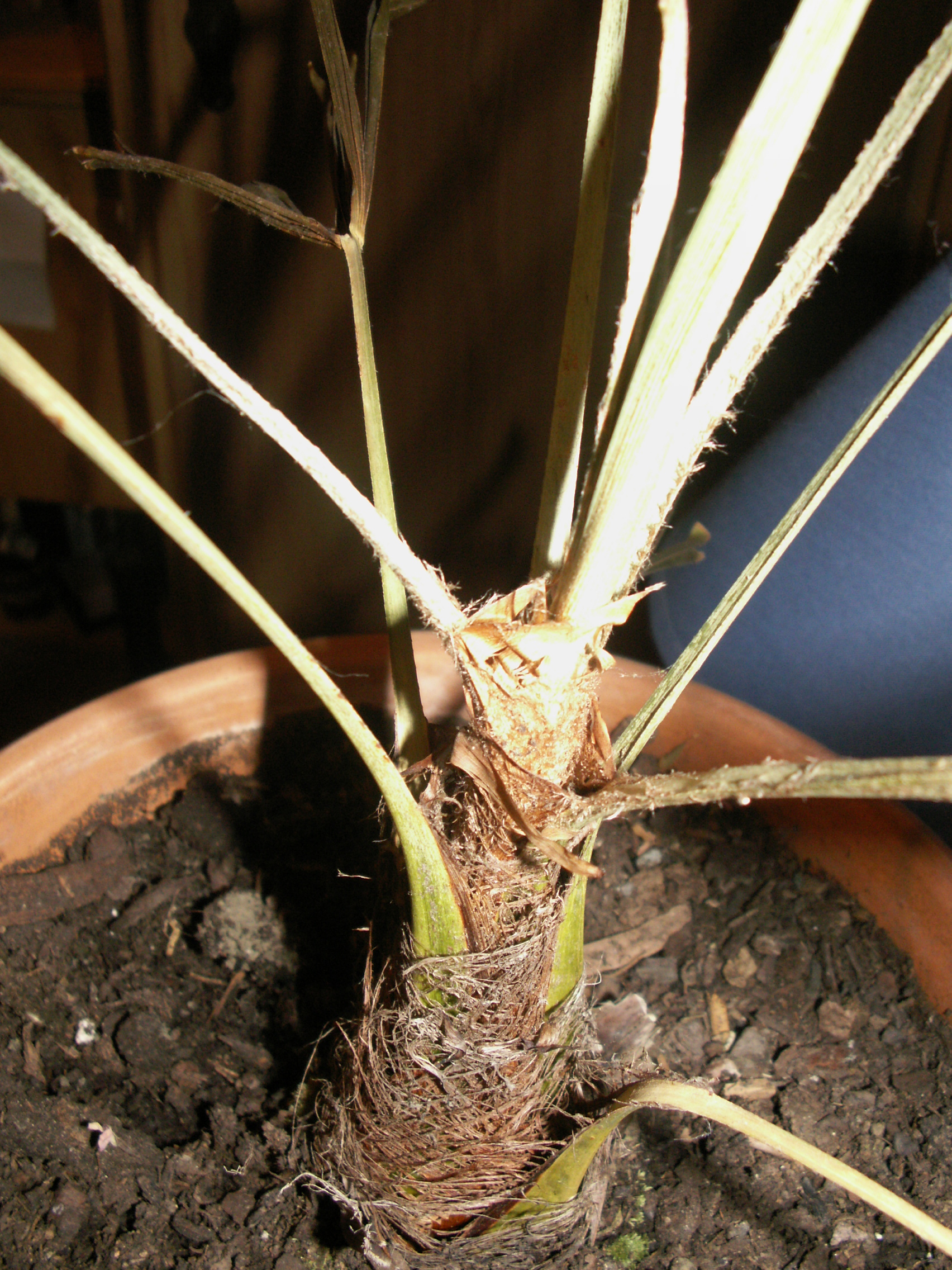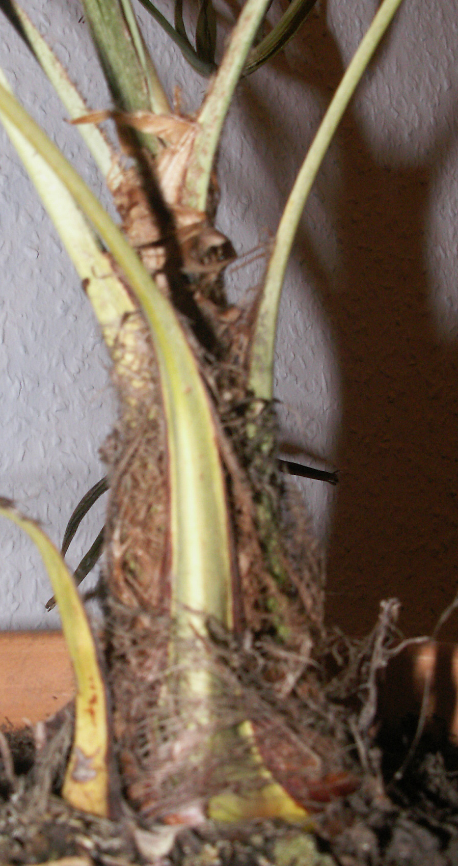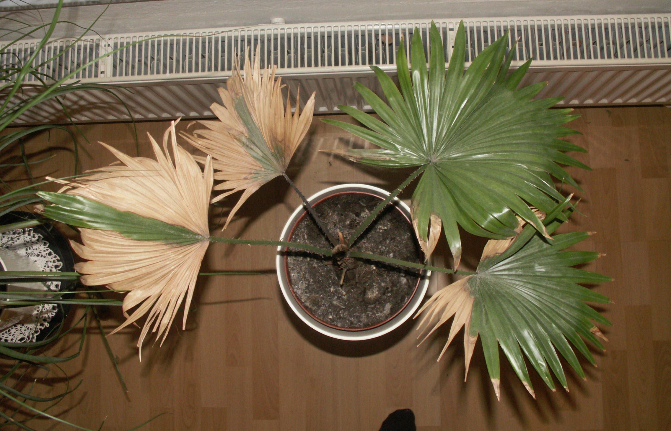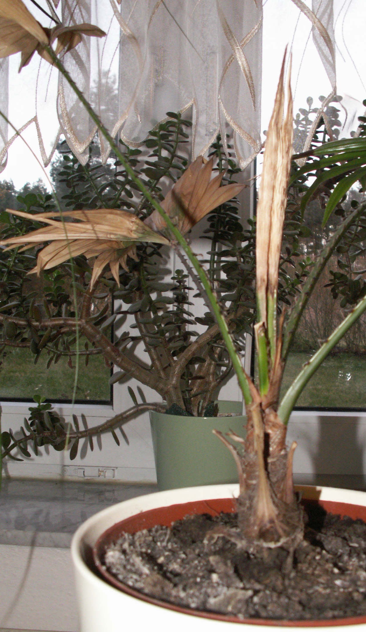 Palme Nummer 1 haben wir letzten Sommer gekauft, sie ist eigentlich für den Garten gedacht, muss jedoch überwintert werden. Im Garten ging es ihr gut, es hat regelmäßig geregnet, so dass sie sogar ein, zwei neue Wedel bekommen hat. Als wir sie dann aber im Oktober/November reingeholt haben ins Haus (Süd-Fenster; Temp. 18°-20°C) sah sie nach ein paar Wochen so aus, wie dort unten (ersten beiden Fotos)