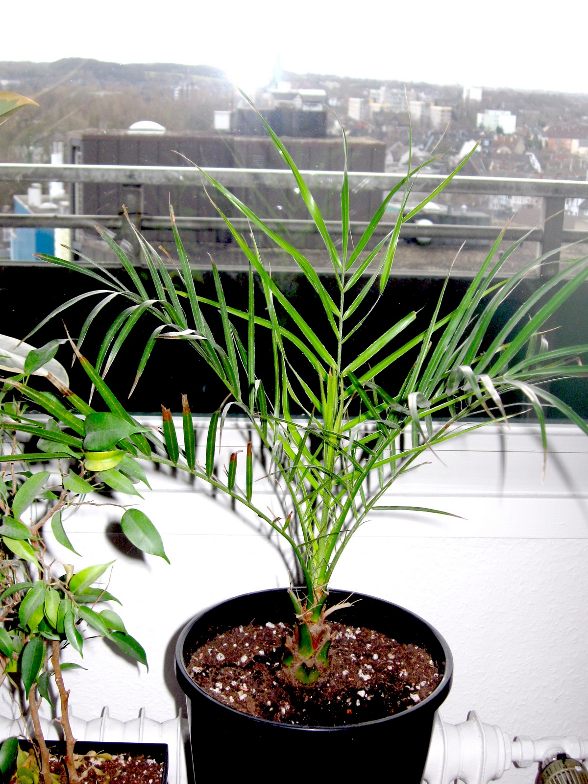 Meine kleine Phoenix hab ich im letzten Jahr gekauft, dann hat der Kater sie halb aufgefressen und heute sieht sie wieder relativ gut aus. Die Wurzeln haben sich wunderbar regeneriert und im Mai soll sie raus auf den Balkon.