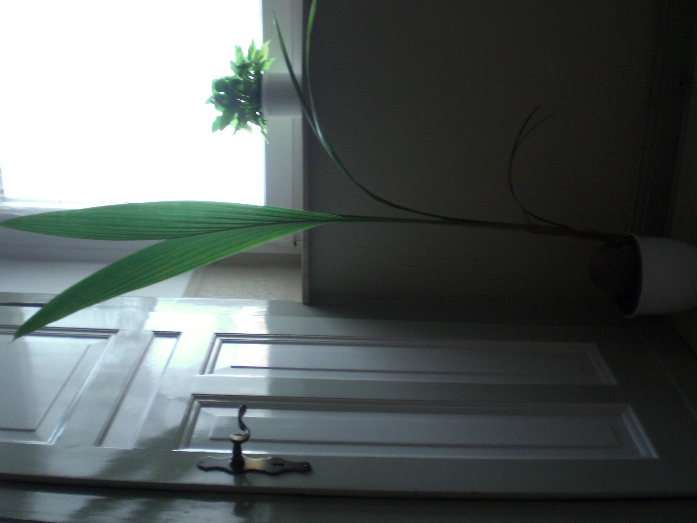 Die Palme wird regelmäßig ein bisschen gegossen und auch mit Wasser besprüht. Sie steht direkt vor einem Fenster, bekommt aber keine Sonne.