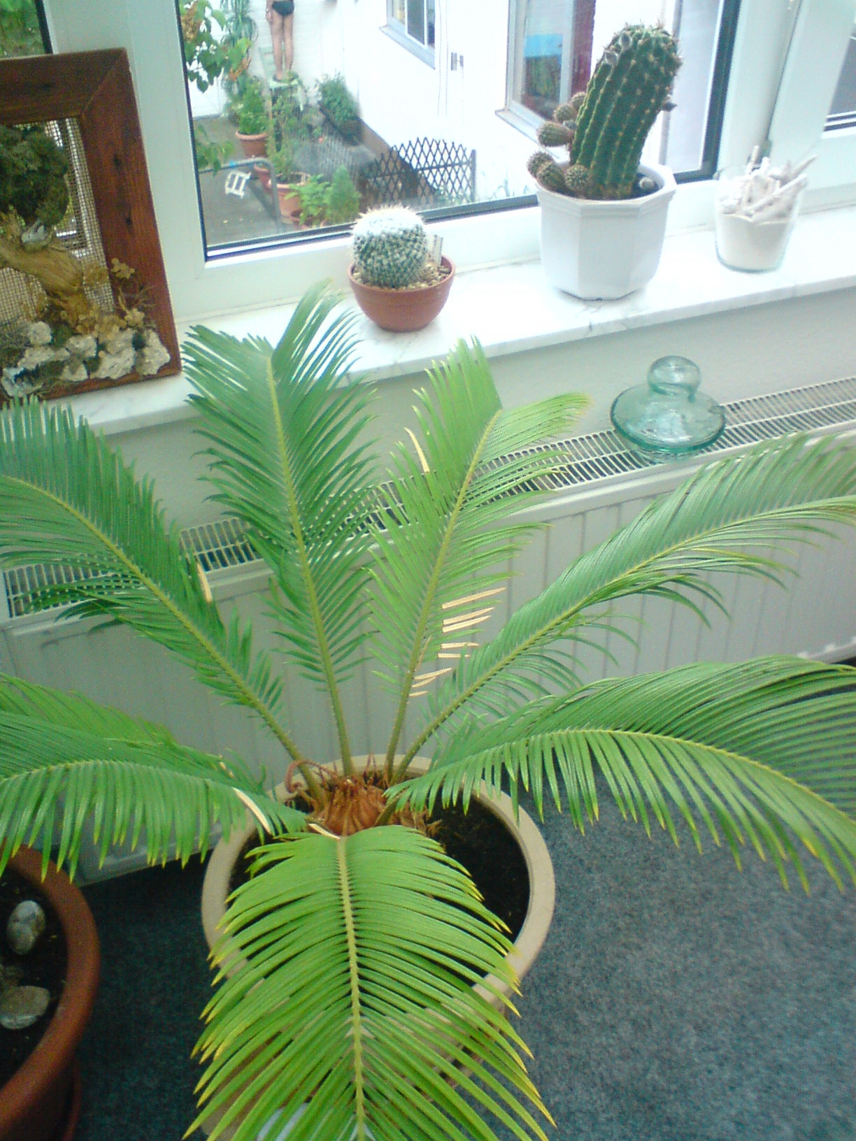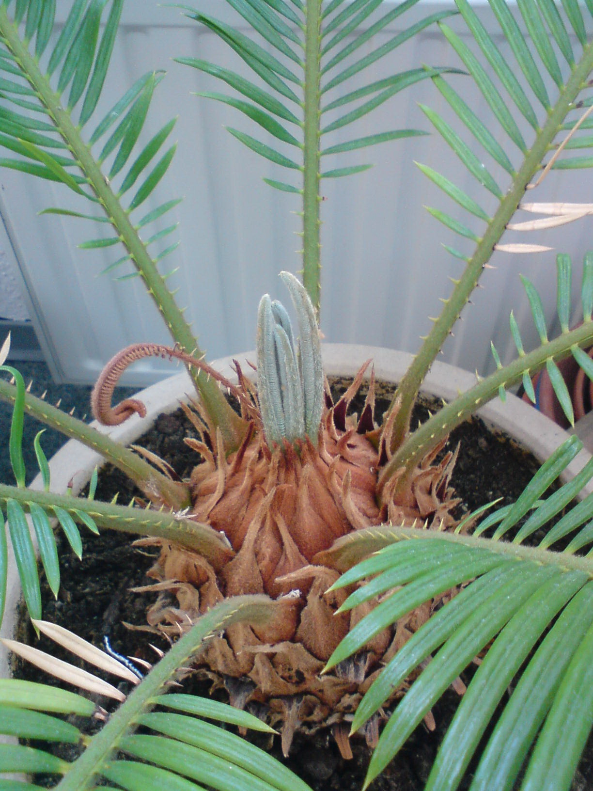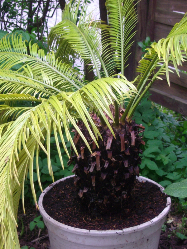 Mein Palmfarn ist jetzt 27 Jahre alt und hat bislang immer problemlos kühl und hell überwintert und bis vor 3 Jahren regelmäßig jeden Sommer einen Kranz neuer Blätter bekommen. Nun scheint das nicht mehr zu funktionieren. Er hat schon das dritte Jahr keine neuen Blätter mehr bekommen, im vorletzten Jahr gegen Ende des Sommers ein paar neue Blätter, die dann im Winter vertrocknet/verkümmert sind. Ich habe so einen Langzeitdünger in die Erde gemischt, im Sommer. Er stand im Sommer immer draußen, im Halbschatten. Mittlerweile sind die Blätter immer gelber geworden. Wie sieht es mit Dünger aus, mache ich da etwas falsch? Oder mit dem Wasser? Hier regnet es relativ häufig, und das Wasser auch aus der Leitung ist total weich und kalkarm. Braucht er vielleicht Kalk? Wir haben ihn heute umgetopft, die Wurzeln waren gar nicht so viele, wie ich gedacht hatte. Hab die alte Erde abgeklopft und in neue Erde eingetopft. Immerhin hatte er 6 Tochterzwiebeln, oder wie man das nennt, gebildet, die ich abgetrennt habe und eingepflanzt. Davon hatten zwei sogar ein neues Blatt gebildet.