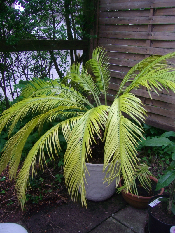 Mein Palmfarn ist jetzt 27 Jahre alt und hat bislang immer problemlos kühl und hell überwintert und bis vor 3 Jahren regelmäßig jeden Sommer einen Kranz neuer Blätter bekommen. Nun scheint das nicht mehr zu funktionieren. Er hat schon das dritte Jahr keine neuen Blätter mehr bekommen, im vorletzten Jahr gegen Ende des Sommers ein paar neue Blätter, die dann im Winter vertrocknet/verkümmert sind. Ich habe so einen Langzeitdünger in die Erde gemischt, im Sommer. Er stand im Sommer immer draußen, im Halbschatten. Mittlerweile sind die Blätter immer gelber geworden. Wie sieht es mit Dünger aus, mache ich da etwas falsch? Oder mit dem Wasser? Hier regnet es relativ häufig, und das Wasser auch aus der Leitung ist total weich und kalkarm. Braucht er vielleicht Kalk? Wir haben ihn heute umgetopft, die Wurzeln waren gar nicht so viele, wie ich gedacht hatte. Hab die alte Erde abgeklopft und in neue Erde eingetopft. Immerhin hatte er 6 Tochterzwiebeln, oder wie man das nennt, gebildet, die ich abgetrennt habe und eingepflanzt. Davon hatten zwei sogar ein neues Blatt gebildet.